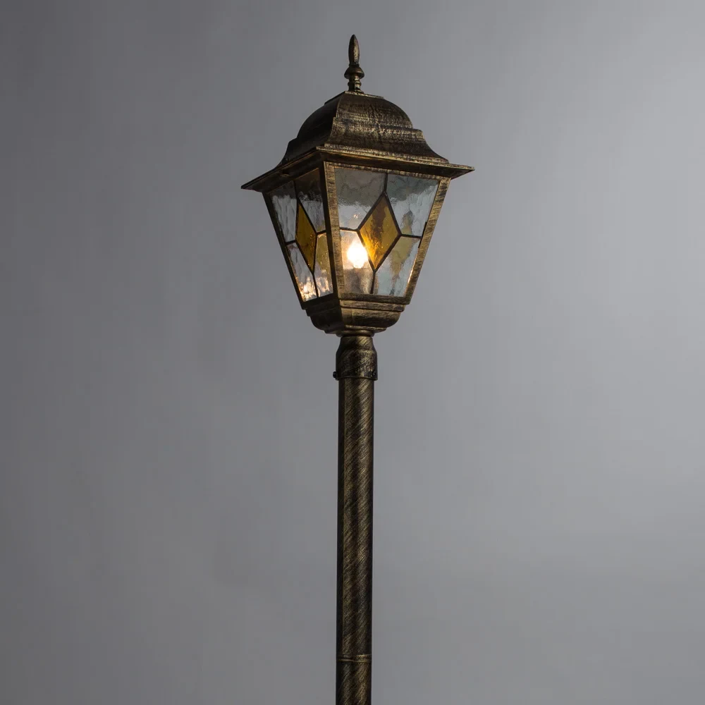 Столб фонарный уличный Arte Lamp BERLIN A1016PA-1BN от Arte Lamp, в стиле классика, мозаика, тиффани. Материал — алюминий, цвет черно-золотой, плафон из витражное стекло, цвет плафона прозрачный, форма плафона — четырехгранник. Модель имеет 1 лампу, цоколь E27, мощность 100 Вт. Степень защиты IP44. Габариты: высота 1200 мм, ширина 180 мм. Коллекция Berlin, фонарный столб — Рассеивающий, фонарный столб — Тиффани.