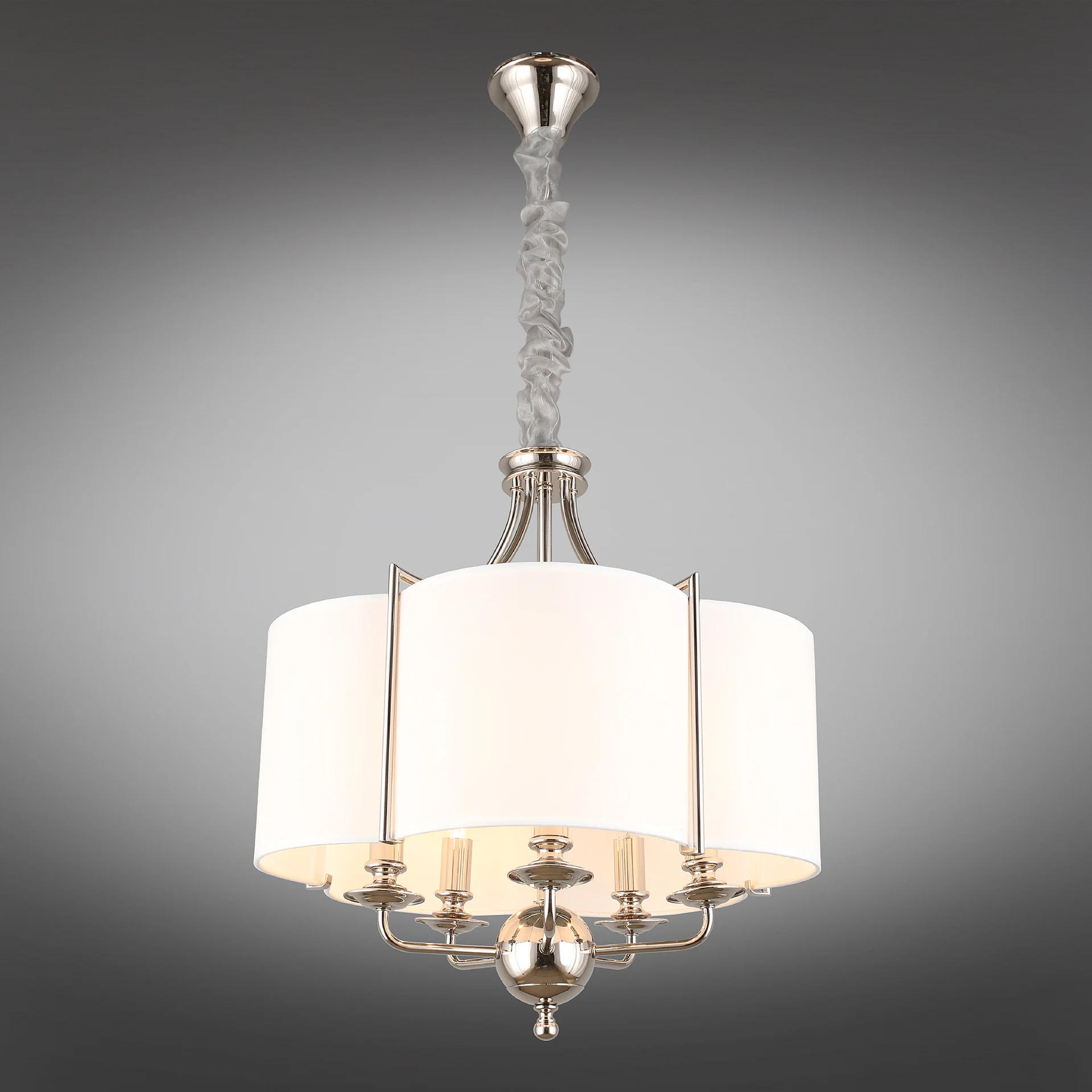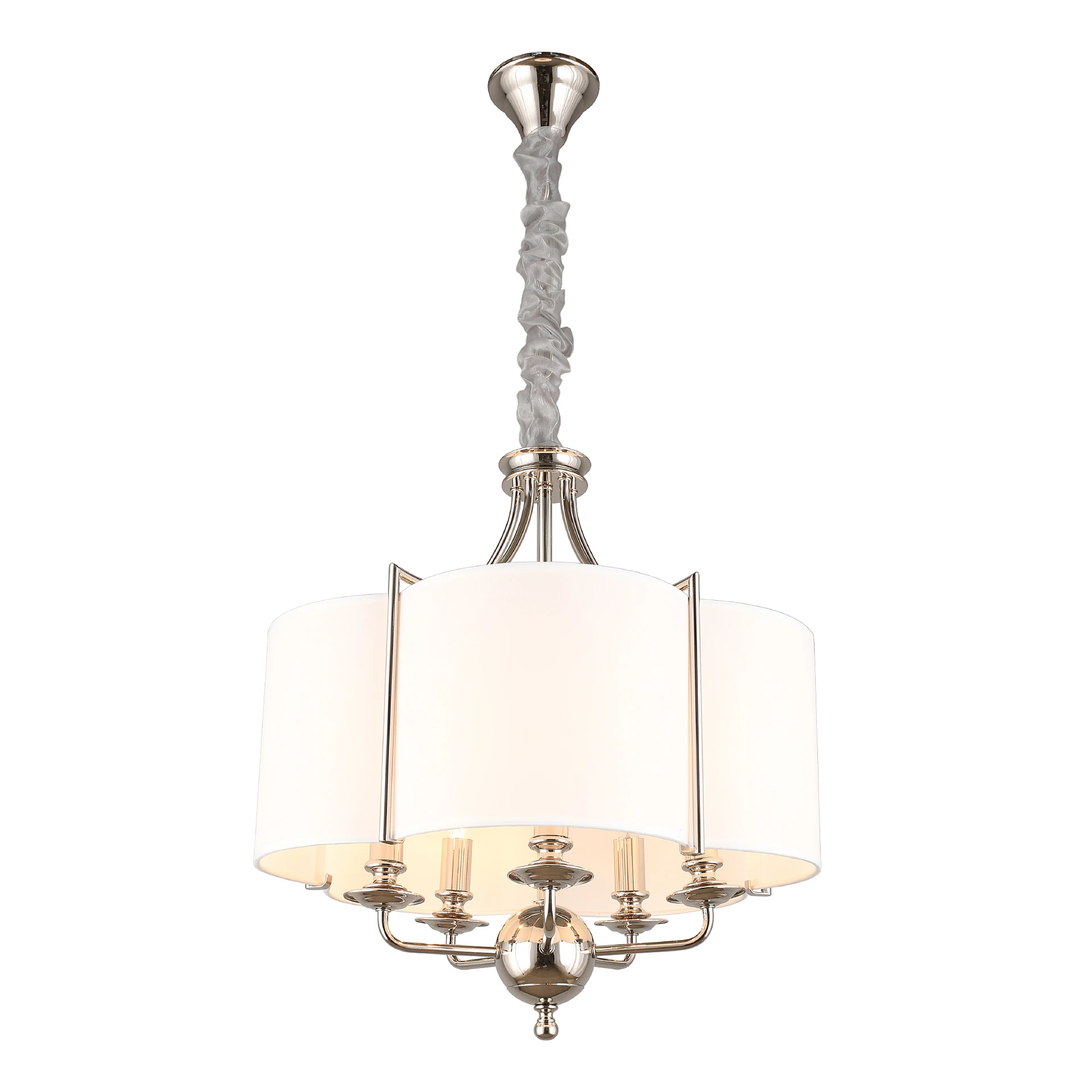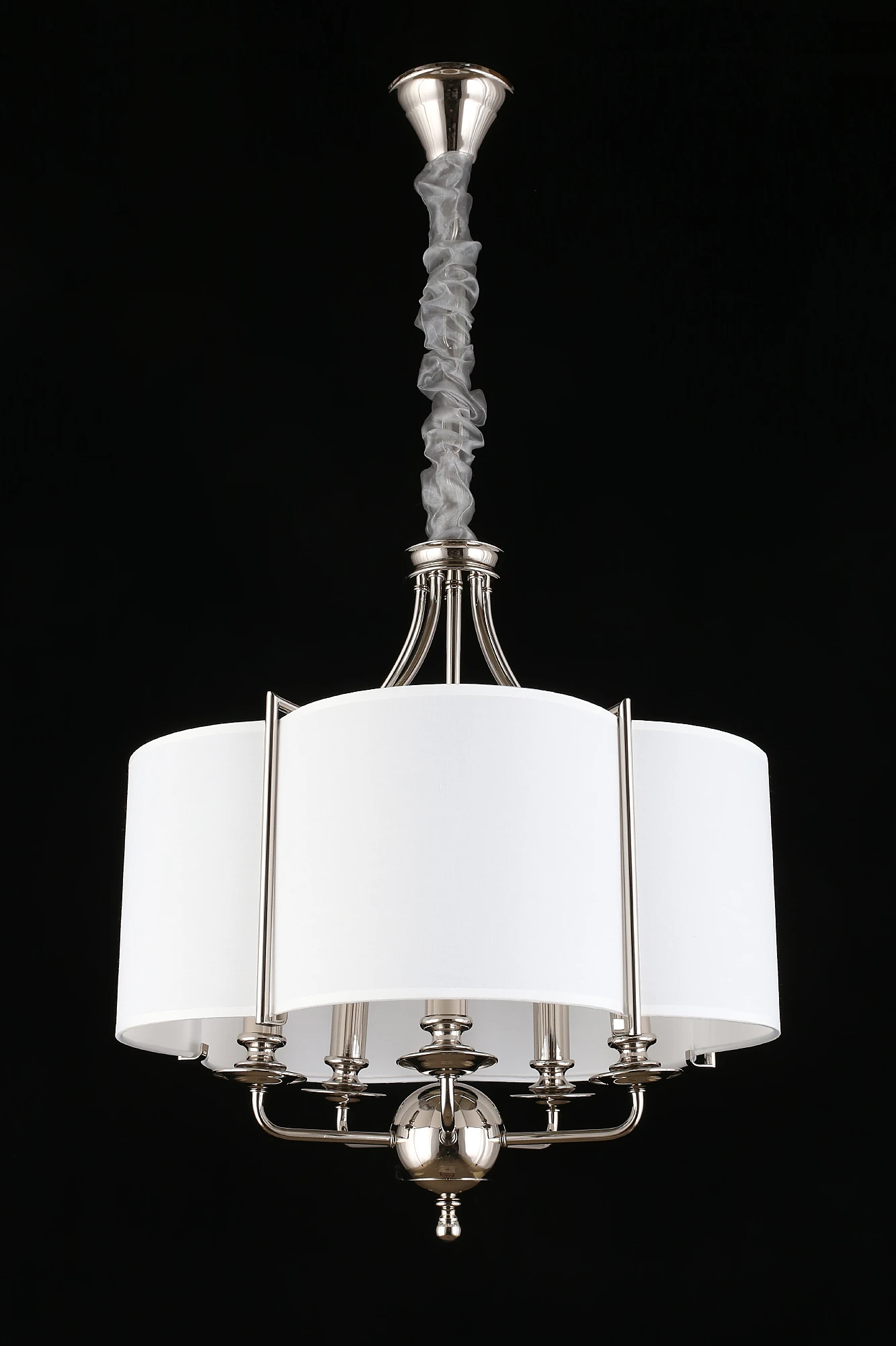 Подвесная люстра Aployt Korin APL.613.03.05 от Aployt, подходит для гостиной, в стиле классика, арт-деко. Материал — металл, цвет хром, плафон из ткань, цвет плафона бежевый, форма плафона — цилиндр. Модель имеет 5 ламп, цоколь E14, мощность 200 Вт. Крепление — крюк. Габариты: высота 1500 мм, ширина 500 мм, диаметр 500 мм. Коллекция Korin, световой поток — 2100.