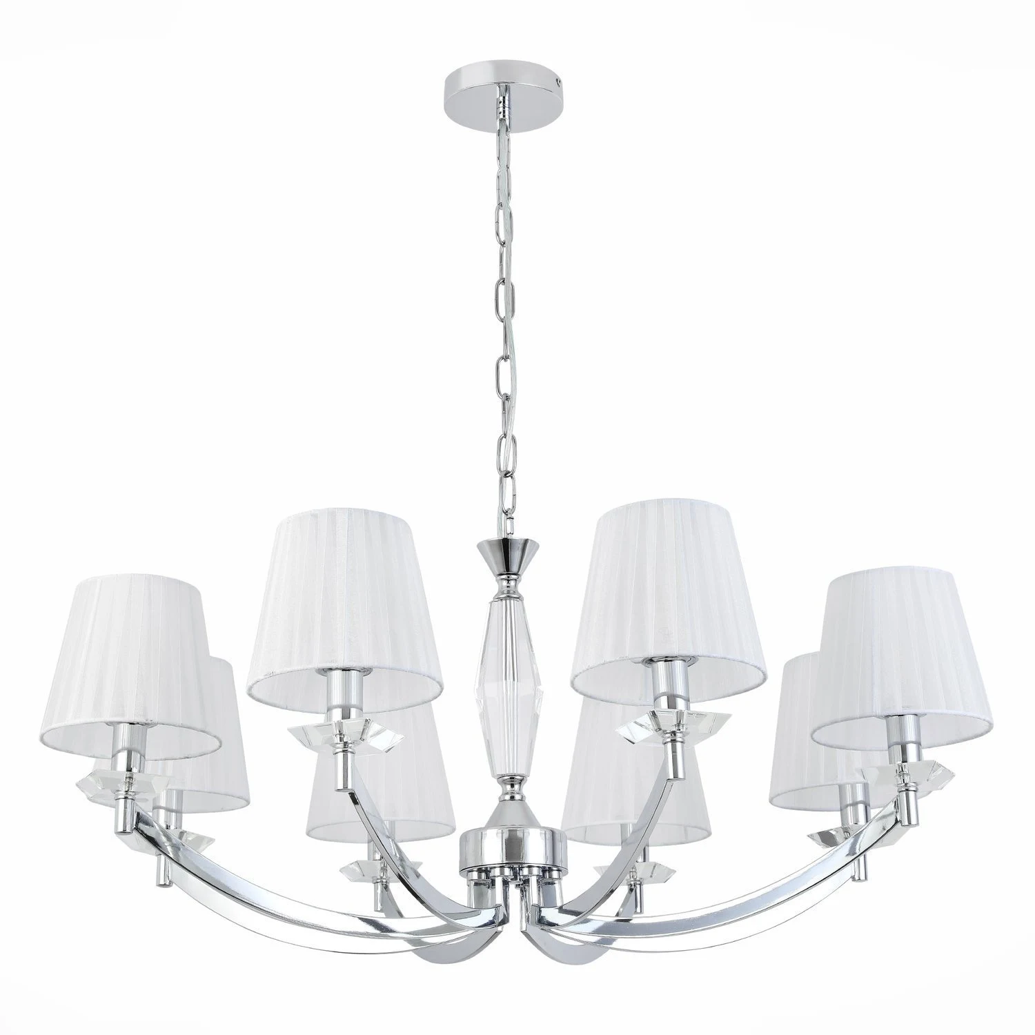 Подвесная люстра ST Luce Bello SL1756.103.08 от ST Luce, подходит для гостиной, для спальни, в стиле современный. Материал — металл, цвет хром, плафон из текстиль, цвет плафона светло-серый, форма плафона — круглый абажур. Модель имеет 8 ламп, цоколь E14, мощность 320 Вт. Крепление — планка. Габариты: высота 760 мм, ширина 900 мм, диаметр 900 мм. Коллекция Bello.
