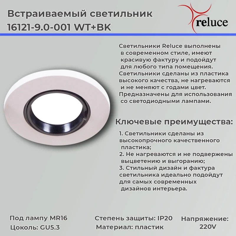 Актуальная цена Встраиваемый светильник Reluce 16121-9.0-001 WT+BK — 6 р.. Если вы нашли этот товар дешевле в другом магазине, отправьте нам ссылку — мы постараемся предложить более выгодные условия. Напишите нам на info@marketsveta.by или позвоните +375 (29) 801 91 06.