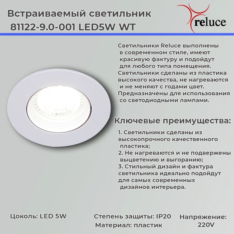 Актуальная цена Встраиваемый светильник Reluce 81122-9.0-001 LED5W WT — 11 р.. Если вы нашли этот товар дешевле в другом магазине, отправьте нам ссылку — мы постараемся предложить более выгодные условия. Напишите нам на info@marketsveta.by или позвоните +375 (29) 801 91 06.