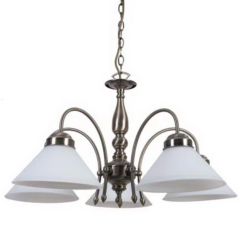 Подвесная люстра Arte Lamp ALFA A3498SP-5AB от Arte Lamp, подходит для кухни, для гостиной, для спальни, для кабинета, в стиле классика, ретро. Материал — металл, цвет античная бронза, плафон из стекла алебастровое, цвет плафона белый. Модель имеет 5 ламп, цоколь E27, мощность 60 Вт. Крепление — крюк. Степень защиты IP20. Габариты: высота 380 мм, ширина 680 мм, диаметр 680 мм. Коллекция Alfa.
