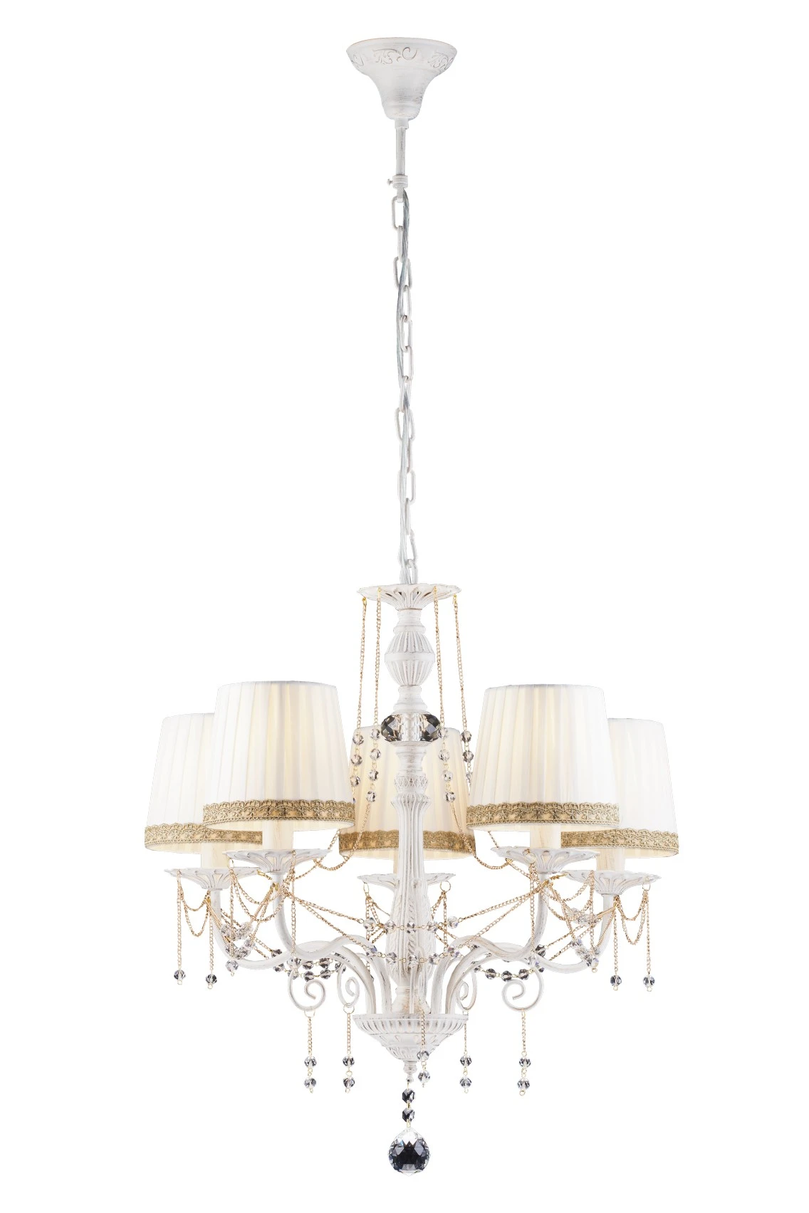 Подвесная люстра Arte Lamp SIERRA A3071LM-5WG от Arte Lamp, подходит для гостиной, для спальни, в стиле классика. Материал — металл, цвет белый, плафон из ткань, форма плафона — круглый абажур. Модель имеет 5 ламп, цоколь E14, мощность 300 Вт. Направление света — вверх, крепление — крюк. Степень защиты IP20. Габариты: высота 60 мм, ширина 560 мм. Декор — хрустальные подвески, коллекция Sierra.