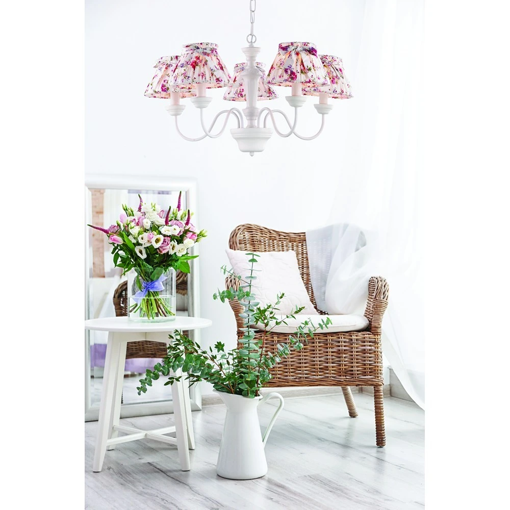 Люстра подвесная с цветочками Bambina A7020LM-5WH Arte Lamp от Arte Lamp, подходит для гостиной, для спальни, для детской, для кабинета, в стиле классика, прованс, флористика. Материал — металл, цвет белый, плафон из ткань, форма плафона — круглый абажур. Модель имеет 5 ламп, цоколь E14, мощность 200 Вт. Направление света — вверх, крепление — крюк. Степень защиты IP20. Габариты: высота 1330 мм, ширина 700 мм. Декор — цветы, коллекция Bambina.