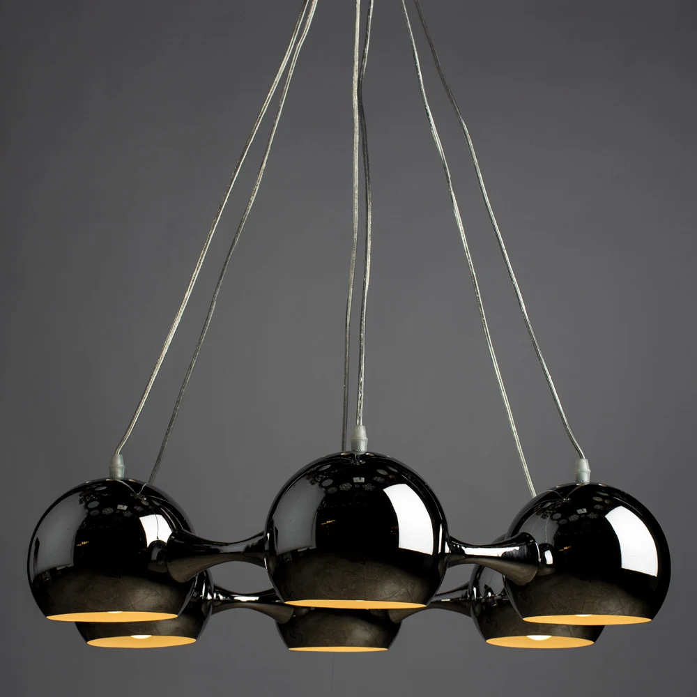 Подвесная люстра Arte Lamp RONDO A8072LM-6CC от Arte Lamp, подходит для кухни, для гостиной, в стиле современный, дизайнерские. Материал — металл, цвет хром, цвет плафона хром, форма плафона — шар. Модель имеет 6 ламп, цоколь E27, мощность 240 Вт. Направление света — вниз, крепление — скоба. Степень защиты IP20. Габариты: высота 140 мм, ширина 640 мм. Коллекция Rondo.