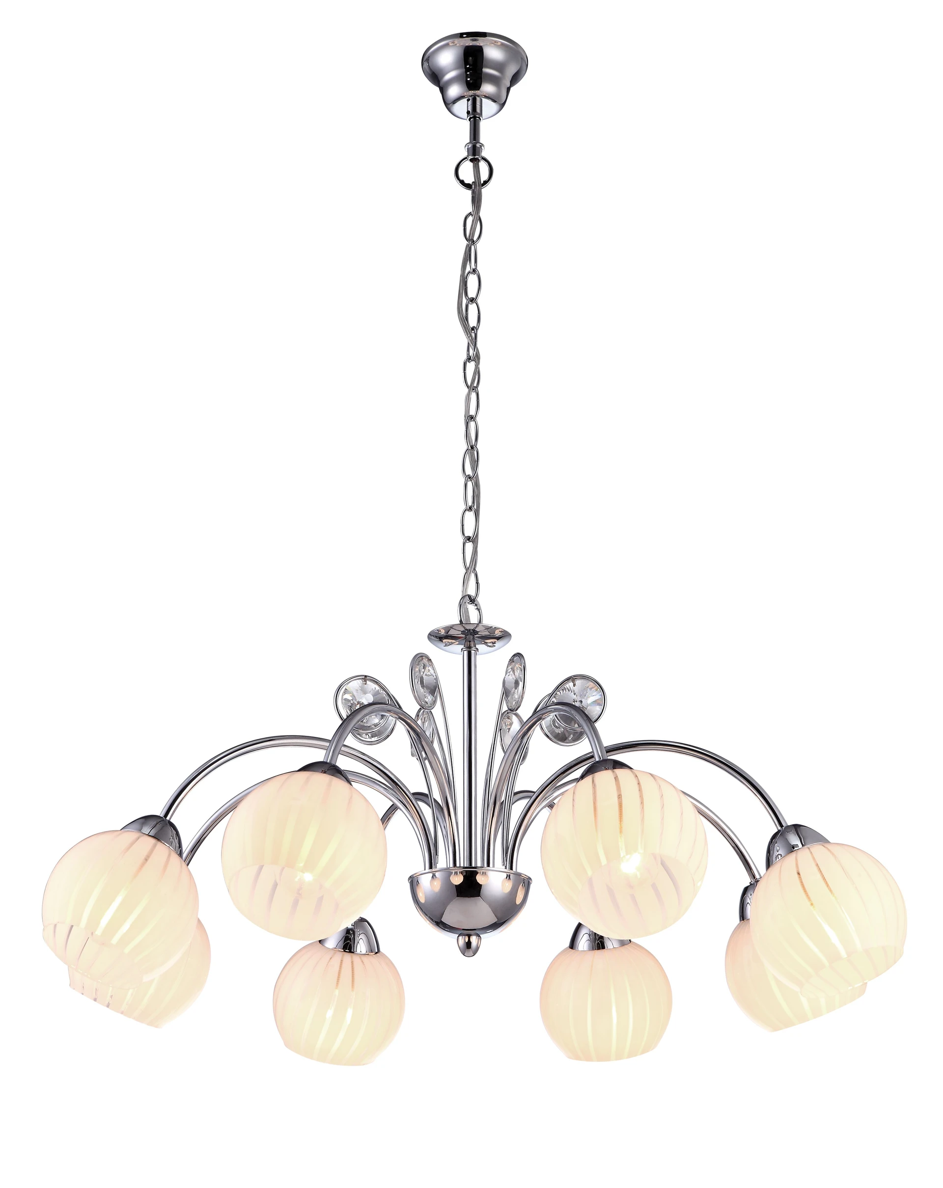 Подвесная люстра Arte Lamp UVA A9524LM-8CC от Arte Lamp, подходит для кухни, для гостиной, для прихожей, в стиле классика. Материал — металл, цвет хром, плафон из стекла, цвет плафона белый, форма плафона — шар. Модель имеет 8 ламп, цоколь E14, мощность 320 Вт. Поддержка диммера, направление света — вниз, крепление — крюк. Степень защиты IP20. Габариты: высота 1000 мм, ширина 740 мм. Коллекция Uva, возможность регулировки высоты — Есть.