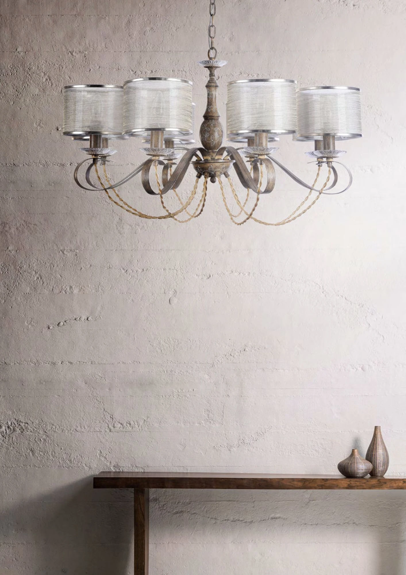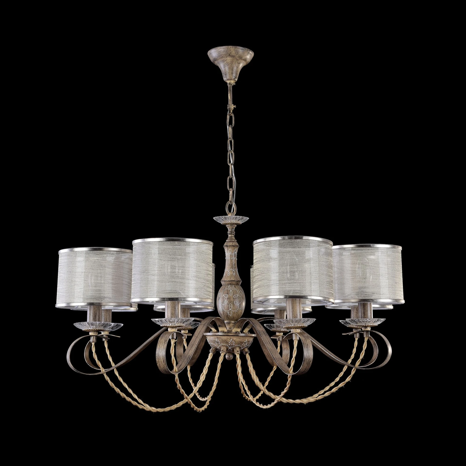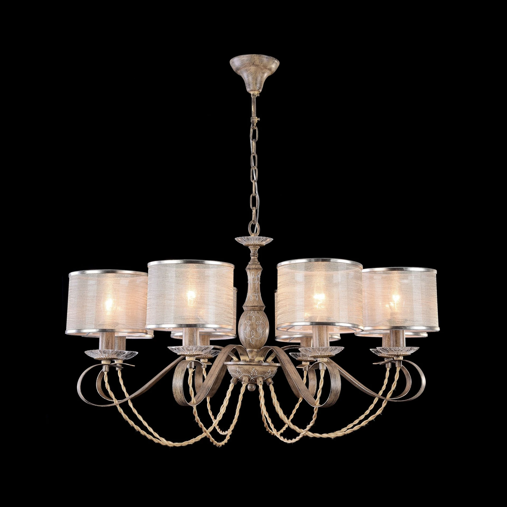 Подвесная люстра Maytoni Cable H357-PL-08-BG от Maytoni, подходит для гостиной, для спальни, в стиле классика, кантри. Материал — металл, цвет бежевый, плафон из органза, цвет плафона белые, форма плафона — цилиндр. Модель имеет 8 ламп, цоколь E14, мощность 40 Вт. Крепление — крюк. Степень защиты IP20. Габариты: высота 1440 мм, ширина 800 мм, диаметр 800 мм. Коллекция Cable.