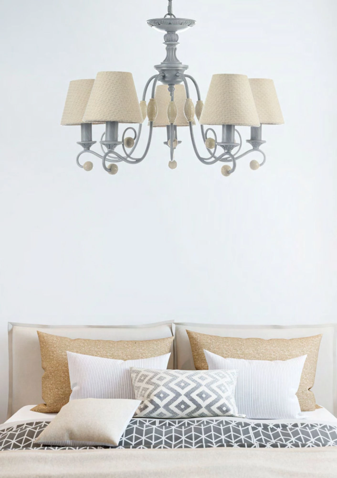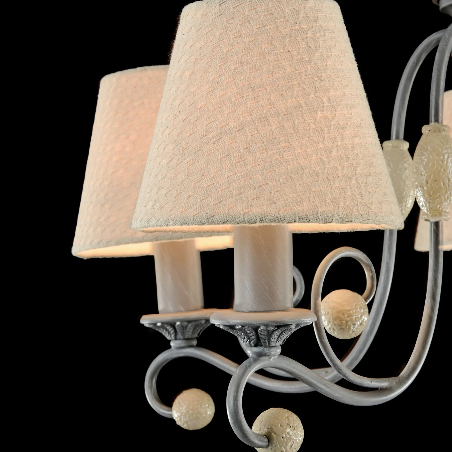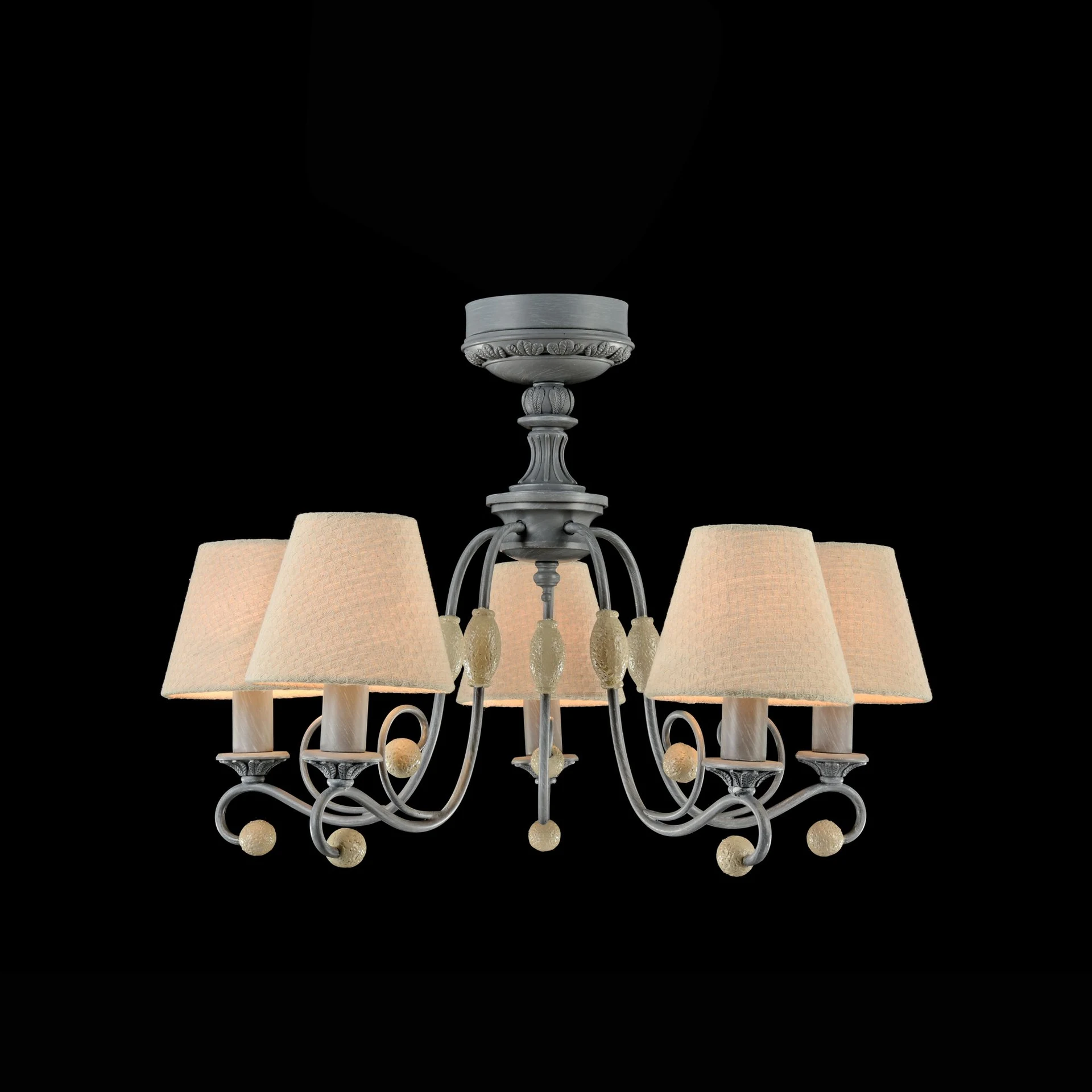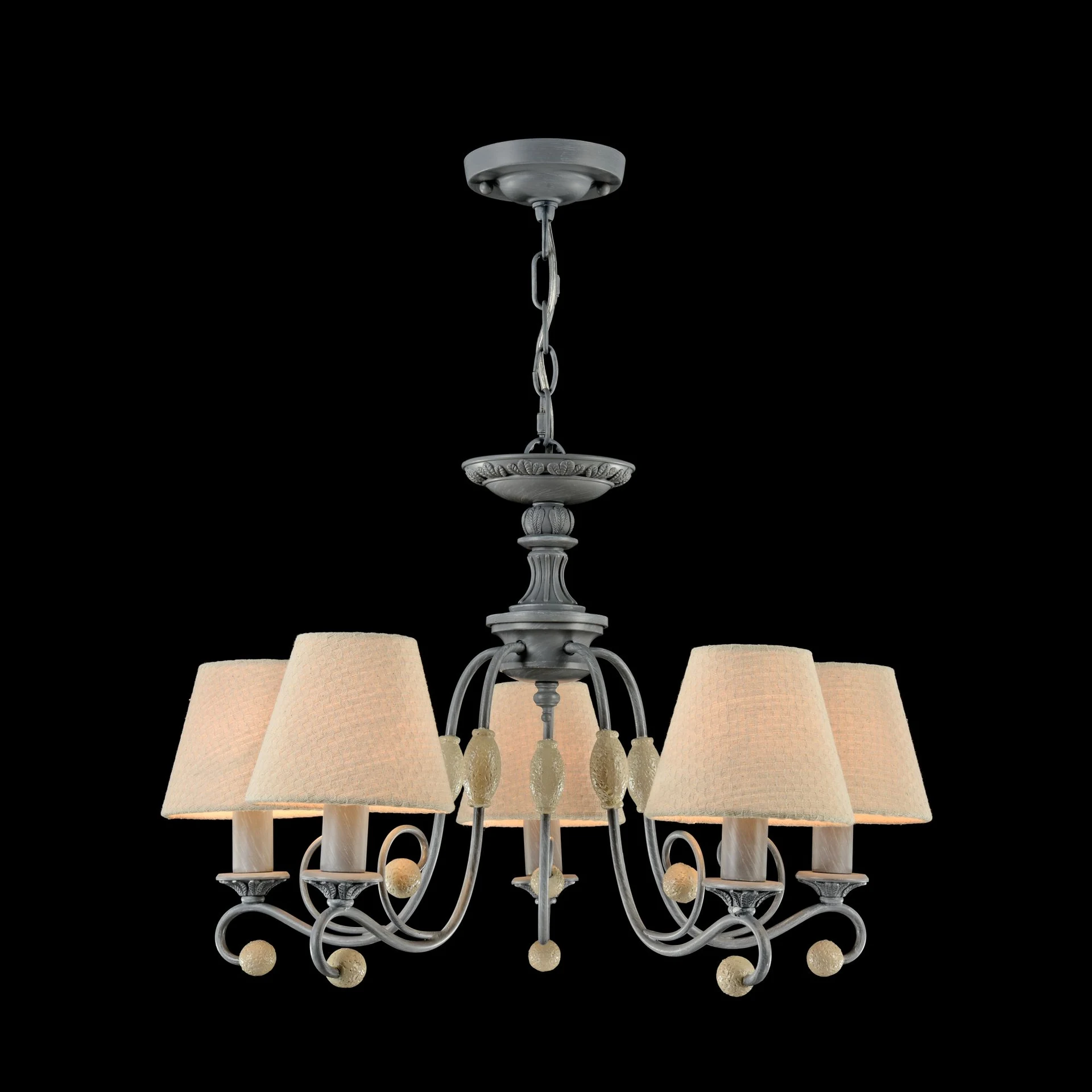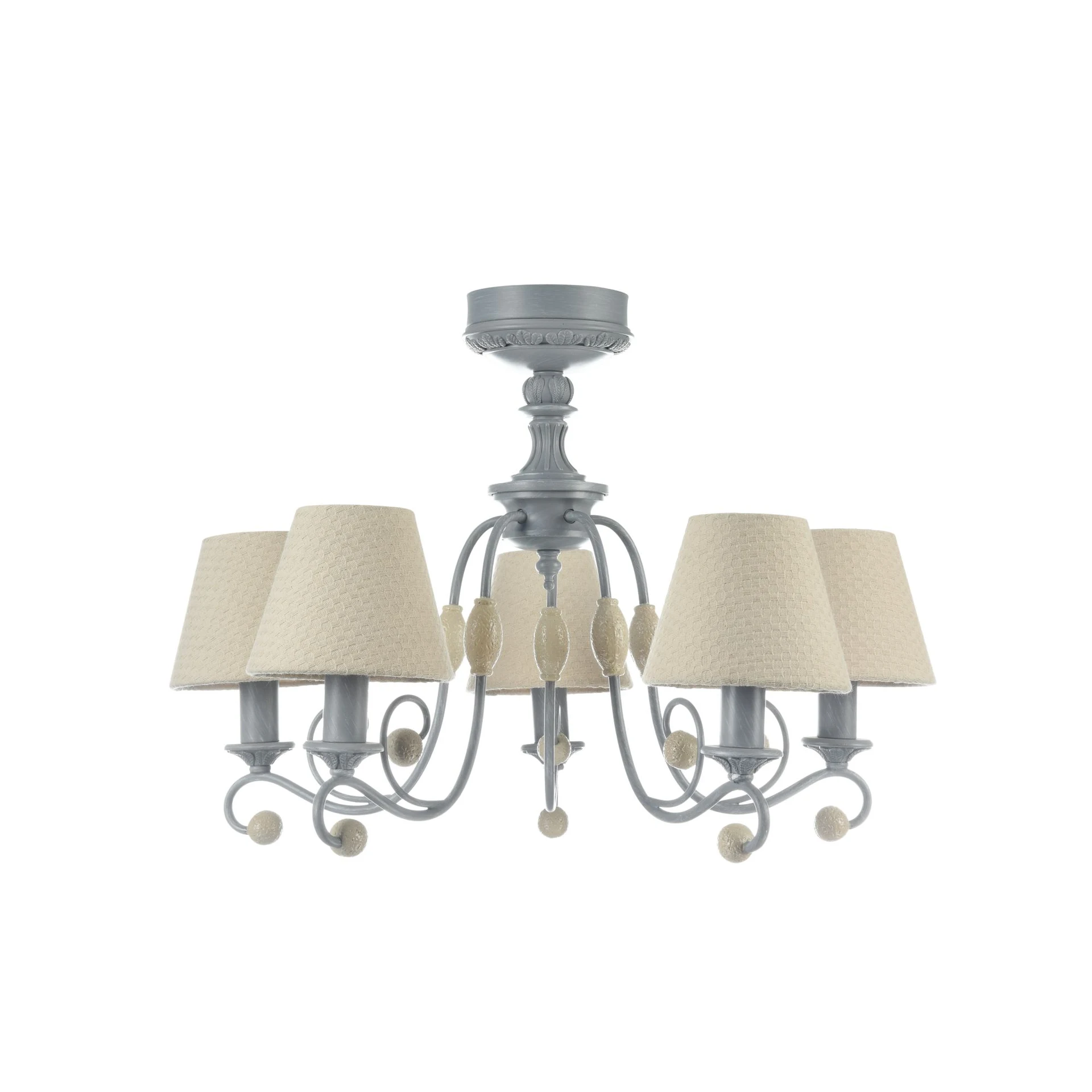 Подвесная люстра Maytoni Rebecca ARM355-PL-05-GR от Maytoni, подходит для гостиной, для спальни, в стиле прованс. Материал — металл, цвет серый, плафон из ткань, цвет плафона бежевый, форма плафона — круглый абажур. Модель имеет 5 ламп, цоколь E14, мощность 40 Вт. Направление света — вверх, крепление — планка. Степень защиты IP20. Габариты: высота 1451 мм, ширина 598 мм, диаметр 598 мм. Коллекция Rebecca.