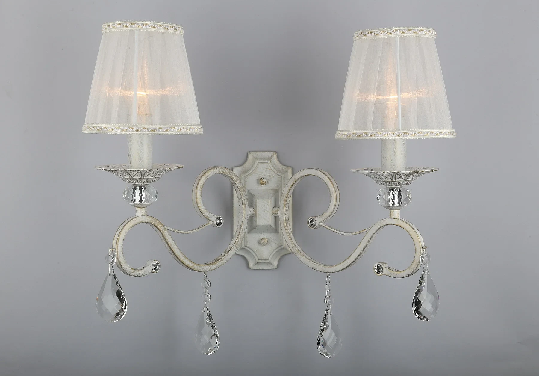 Настенное бра Omnilux Belluno OML-79101-02 от Omnilux, подходит для гостиной, для спальни, в стиле прованс. Материал — металл, цвет белое золото, плафон из ткань, цвет плафона белый, форма плафона — круглый абажур. Модель имеет 2 лампы, цоколь E14, мощность 80 Вт. Крепление — планка. Габариты: высота 380 мм, ширина 400 мм. Декор — хрустальные подвески, коллекция Belluno, бра — С абажурами, бра — Подвески.