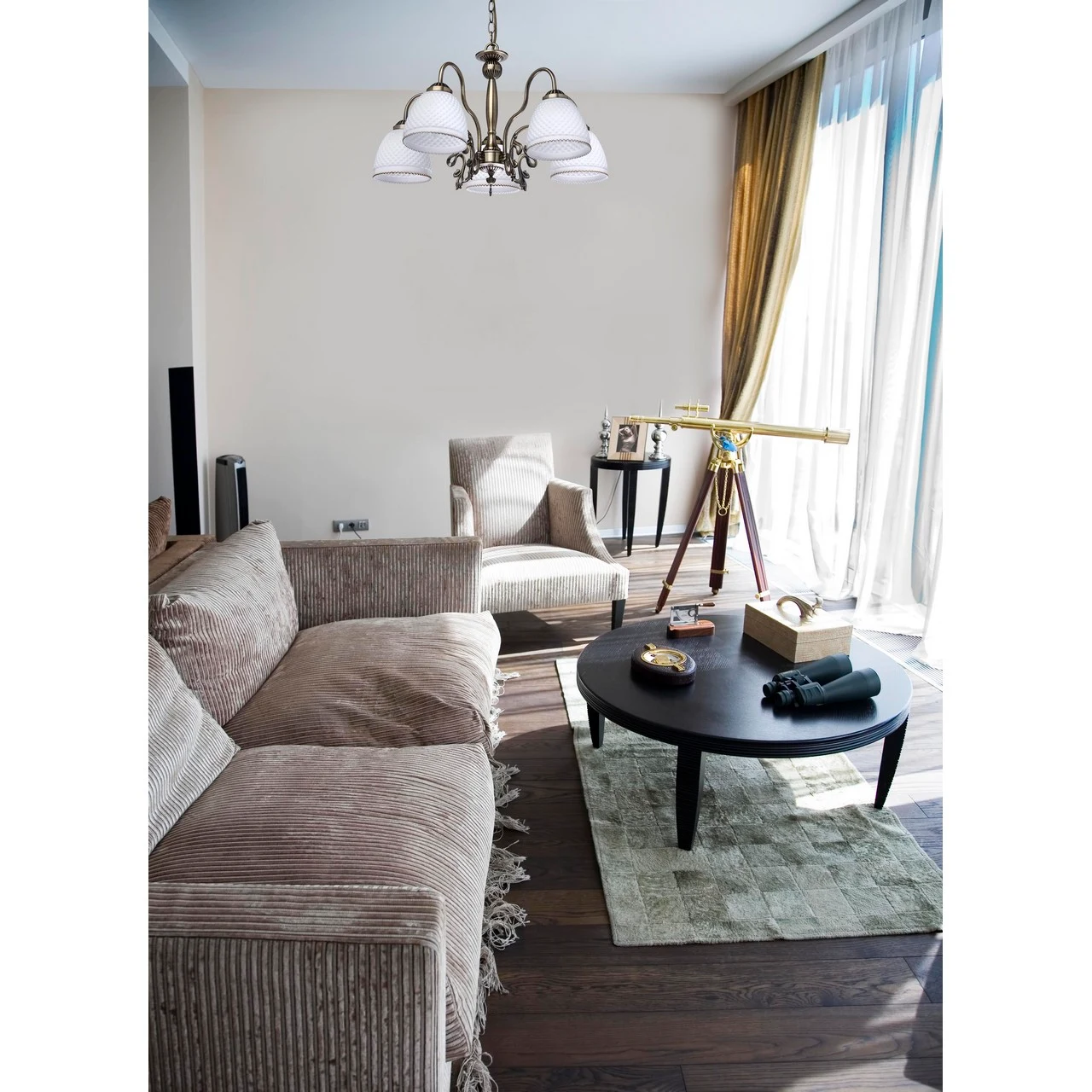 Подвесная люстра De Markt Моника 372012805 от De Markt, подходит для гостиной, для спальни, в стиле классика. Материал — металл, цвет античная бронза, плафон из стекла, цвет плафона белый матовый. Модель имеет 5 ламп, цоколь E27, мощность 60W. Габариты: высота 970 мм, ширина 560 мм, диаметр 560 мм. Коллекция Моника.