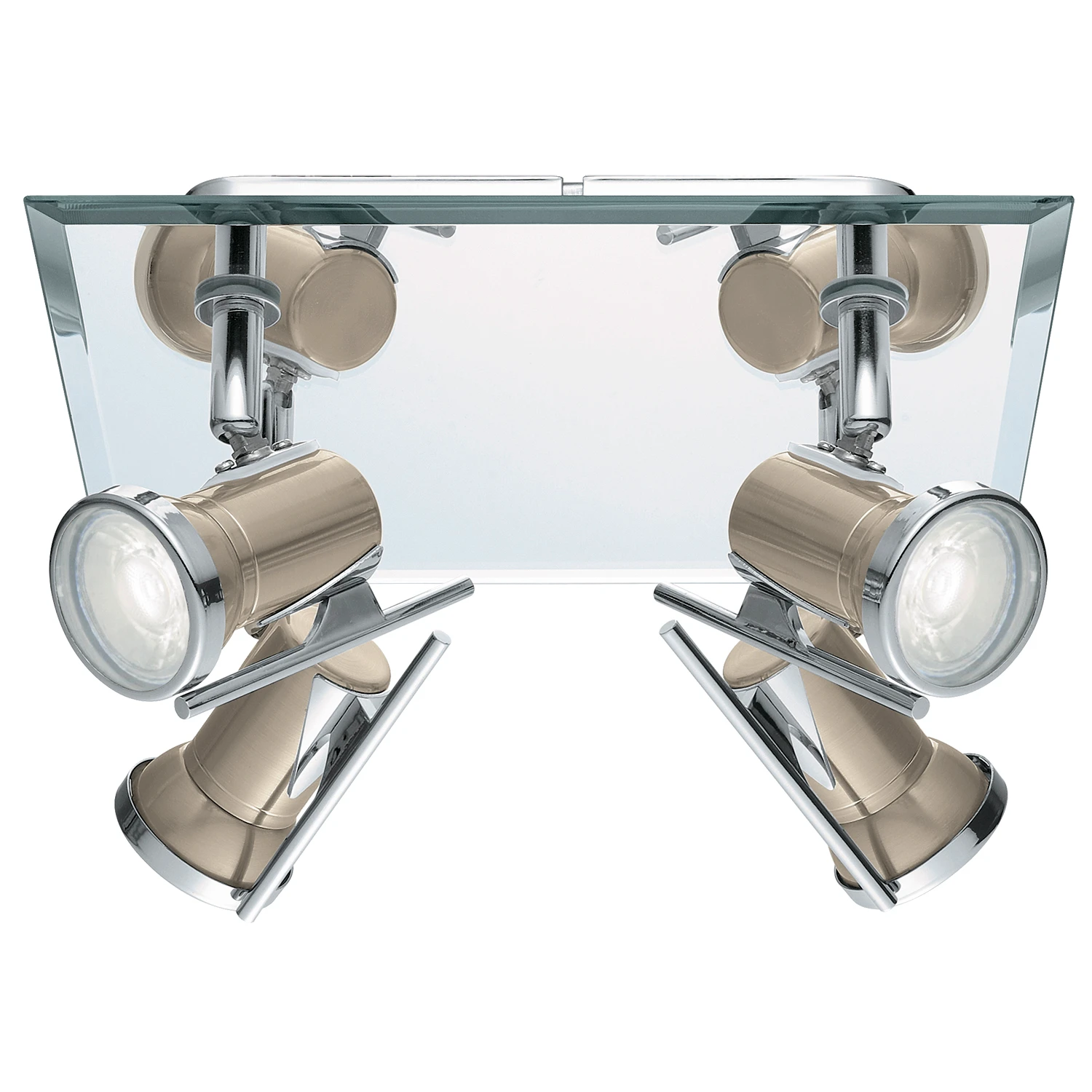 Светильник спот Eglo Tamara 1 94983 от Eglo, в стиле современный. Материал — сталь, цвет никель матовый, плафон из зеркало. Модель имеет 4 лампы, цоколь GU10, мощность 13.2W. Поворотный. Степень защиты IP44. Габариты: высота 260 мм, ширина 240 мм. Коллекция Tamara 1, споты — Металлический плафон, споты — Поворотные.