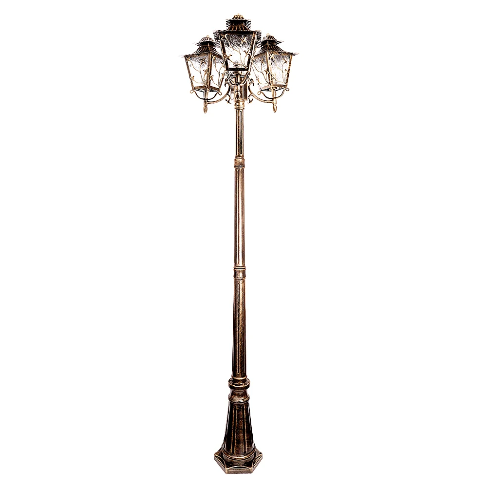 Столб фонарный уличный Feron Палермо 11646 от Feron, в стиле классика. Материал — металл, цвет золото, форма плафона — прозрачный. Модель имеет 3 лампы, цоколь E27, мощность 180 Вт. Направление света — вверх. Степень защиты IP44. Габариты: высота 2290 мм, ширина 570 мм. Декор — лепестки, ветки, коллекция PL638.