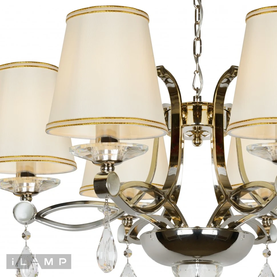 Люстра подвесная Centro iLamp P7505-6 nic от Ilamp, подходит для гостиной, в стиле классика. Материал — металл, цвет никель, плафон из ткань, цвет плафона белый, форма плафона — круглый абажур. Модель имеет 6 ламп, цоколь E14, мощность 40 Вт. Направление света — вверх, крепление — крюк. Степень защиты IP20. Габариты: высота 1350 мм, диаметр 690 мм. Декор — хрустальные подвески, коллекция Centro.