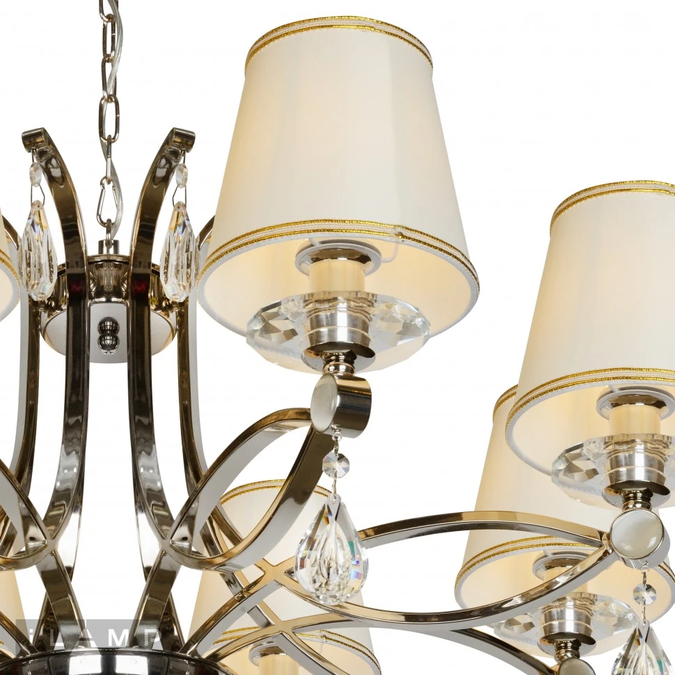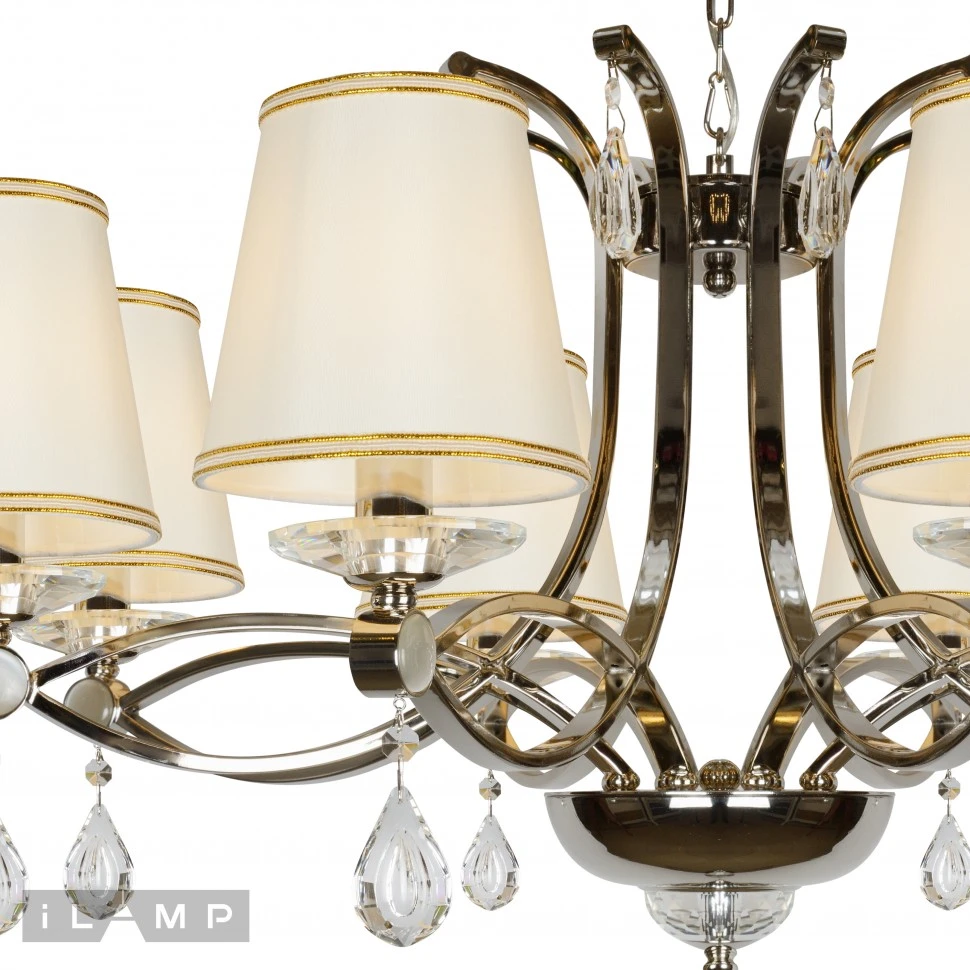 Люстра подвесная Centro iLamp P7505-8 nic от Ilamp, подходит для гостиной, в стиле классика. Материал — металл, цвет никель, плафон из ткань, цвет плафона белый, форма плафона — круглый абажур. Модель имеет 8 ламп, цоколь E14, мощность 40 Вт. Направление света — вверх, крепление — крюк. Степень защиты IP20. Габариты: высота 1450 мм, диаметр 900 мм. Декор — хрустальные подвески, коллекция Centro.