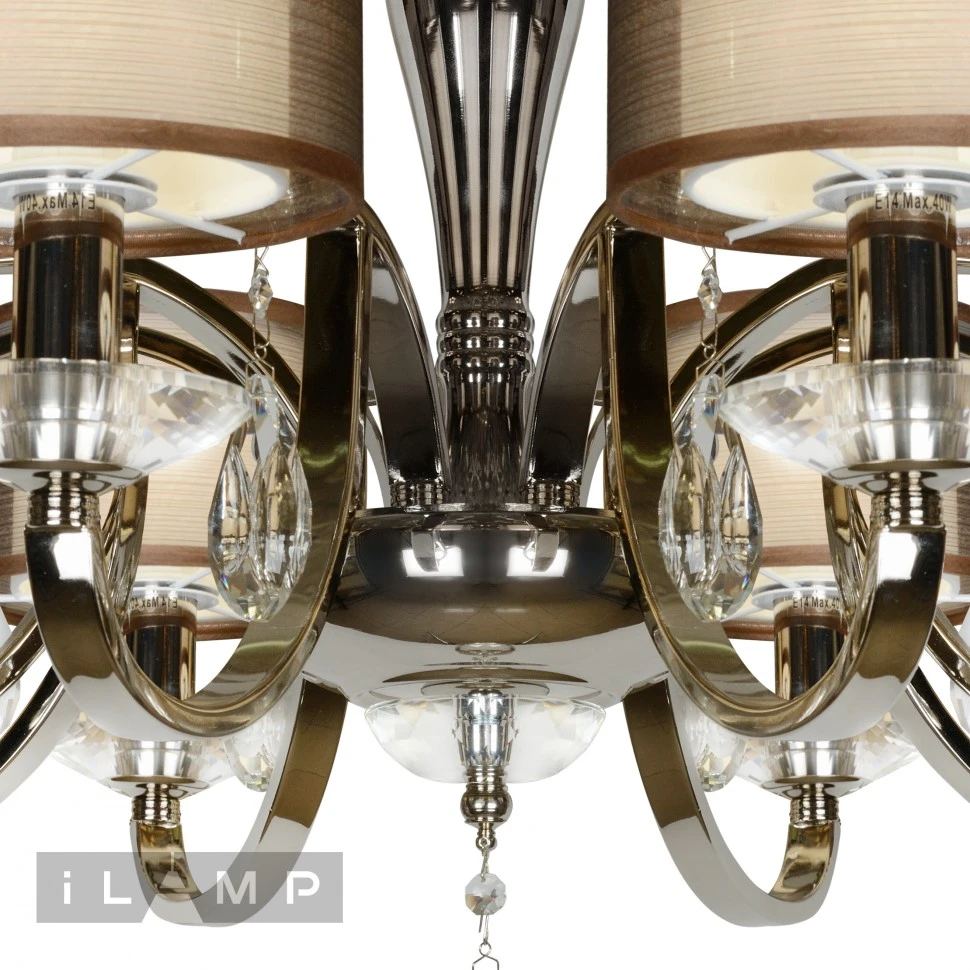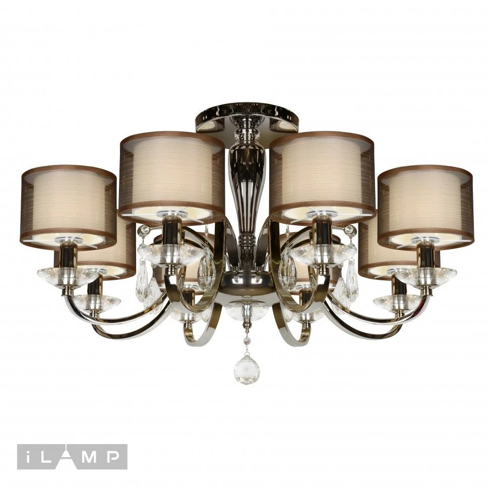 Потолочная люстра iLamp Sofia 88210/8 CR от Ilamp, подходит для гостиной, в стиле современный. Материал — металл, цвет хром, плафон из ткань, цвет плафона коричневый, форма плафона — цилиндр. Модель имеет 8 ламп, цоколь E14, мощность 40 Вт. Направление света — вверх, крепление — монтажная пластина. Габариты: высота 520 мм, диаметр 880 мм. Декор — хрустальные подвески, коллекция Sofia.