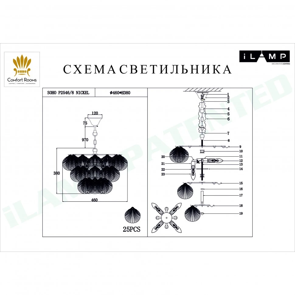 На Люстра подвесная Soho iLamp P2546-8 NIC от Ilamp действует официальная гарантия производителя — от 2 лет и более. По вопросам гарантии в Беларуси обращайтесь по телефону +375 (29) 801 91 06 или на info@marketsveta.by.