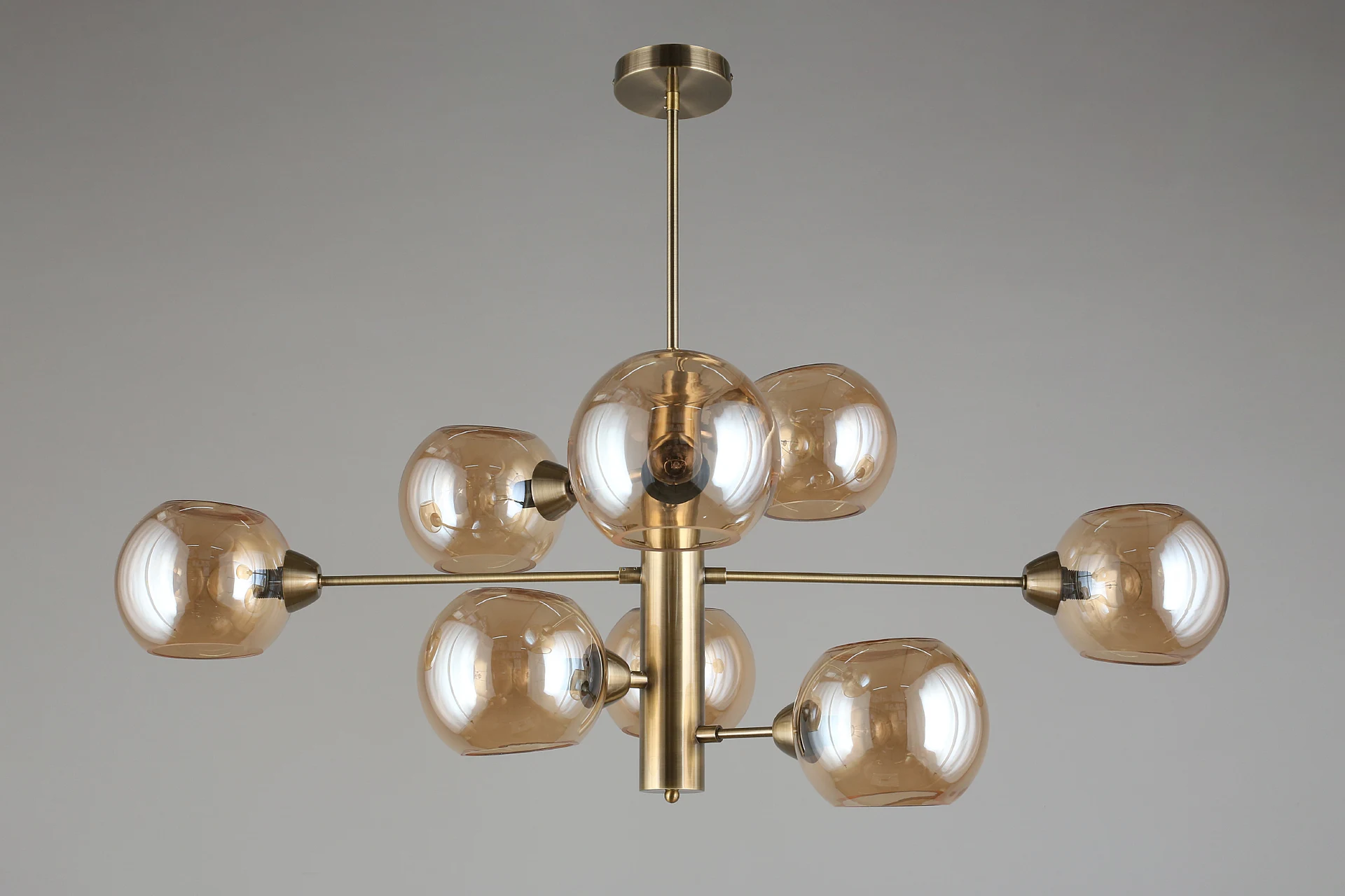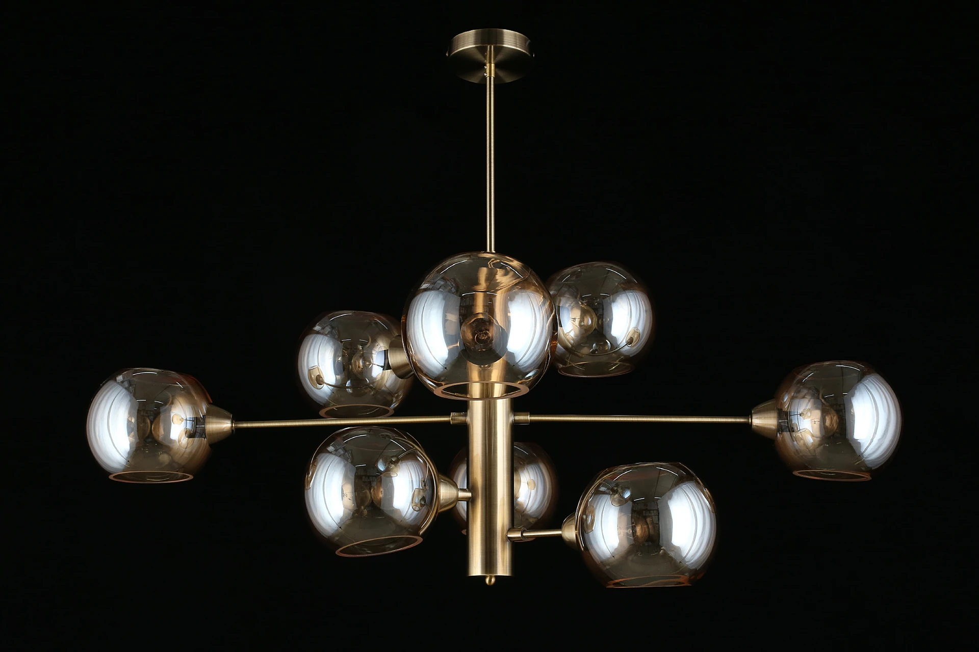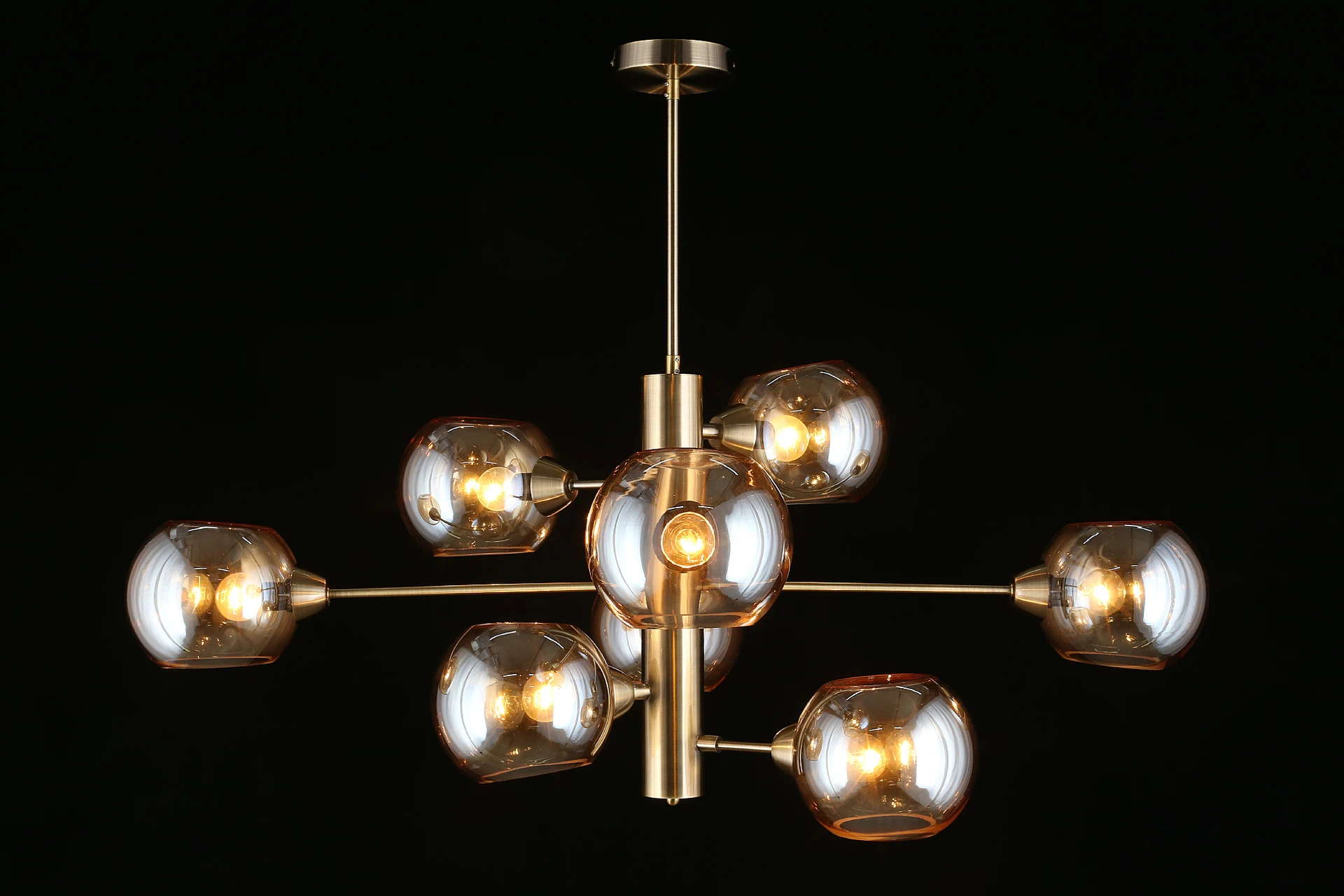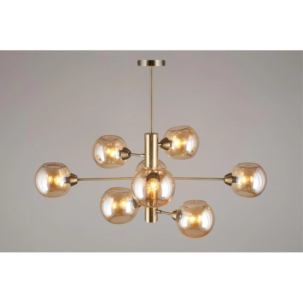 Люстра на штанге Aployt Ameli APL.904.17.08 от Aployt, подходит для гостиной, в стиле современный. Материал — металл, цвет латунь, плафон из стекла, цвет плафона янтарный, форма плафона — шар. Модель имеет 8 ламп, цоколь E14, мощность 320 Вт. Крепление — планка. Габариты: высота 980 мм, ширина 1000 мм. Коллекция Ameli, световой поток — 3360.