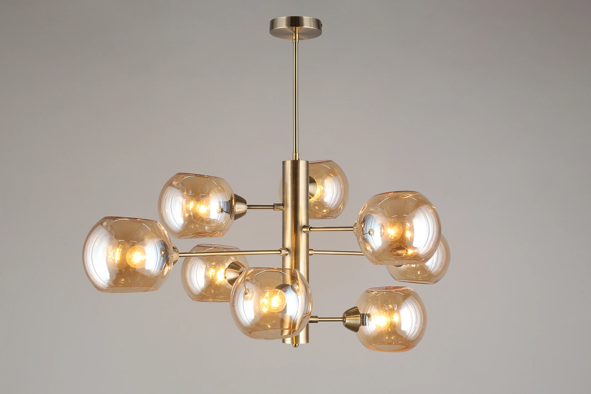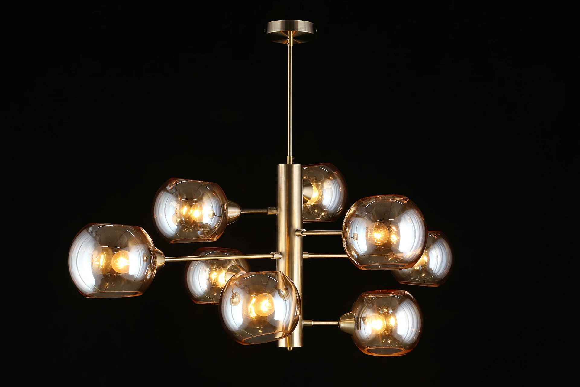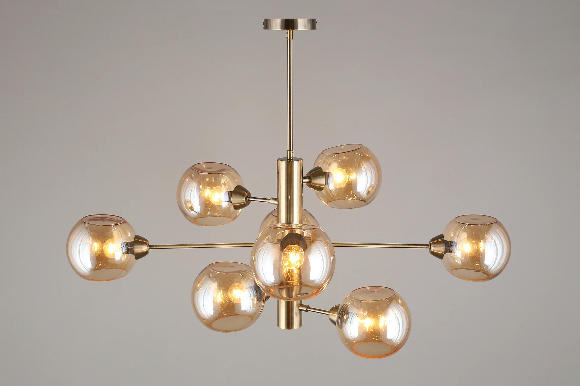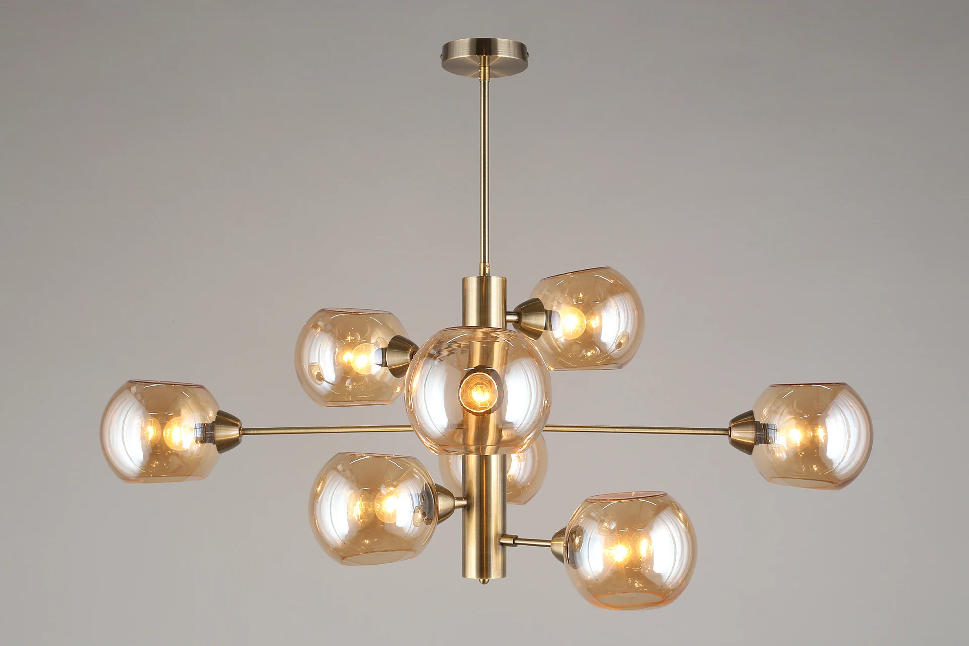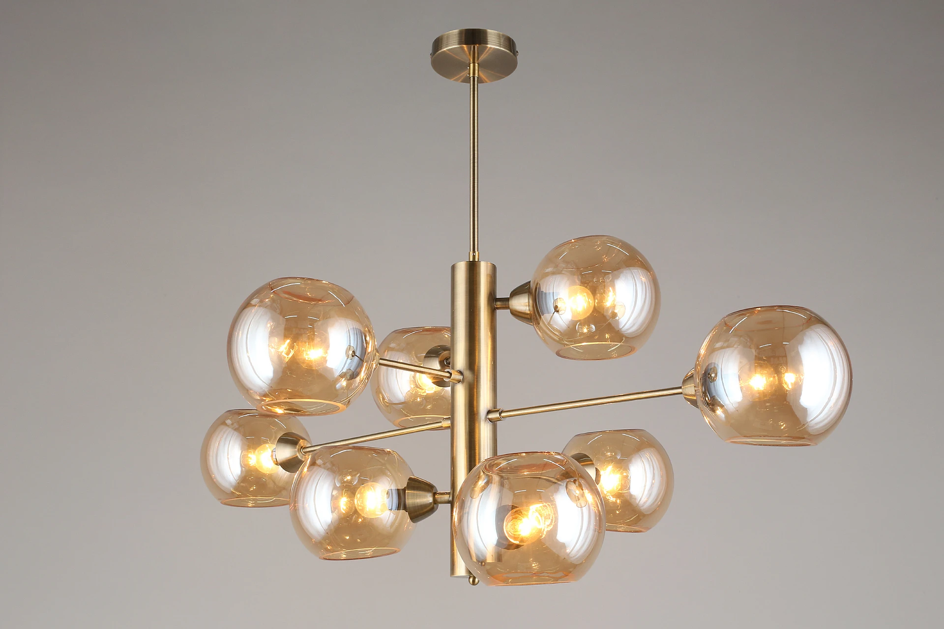 Люстра на штанге Aployt Ameli APL.904.17.08 от Aployt, подходит для гостиной, в стиле современный. Материал — металл, цвет латунь, плафон из стекла, цвет плафона янтарный, форма плафона — шар. Модель имеет 8 ламп, цоколь E14, мощность 320 Вт. Крепление — планка. Габариты: высота 980 мм, ширина 1000 мм. Коллекция Ameli, световой поток — 3360.