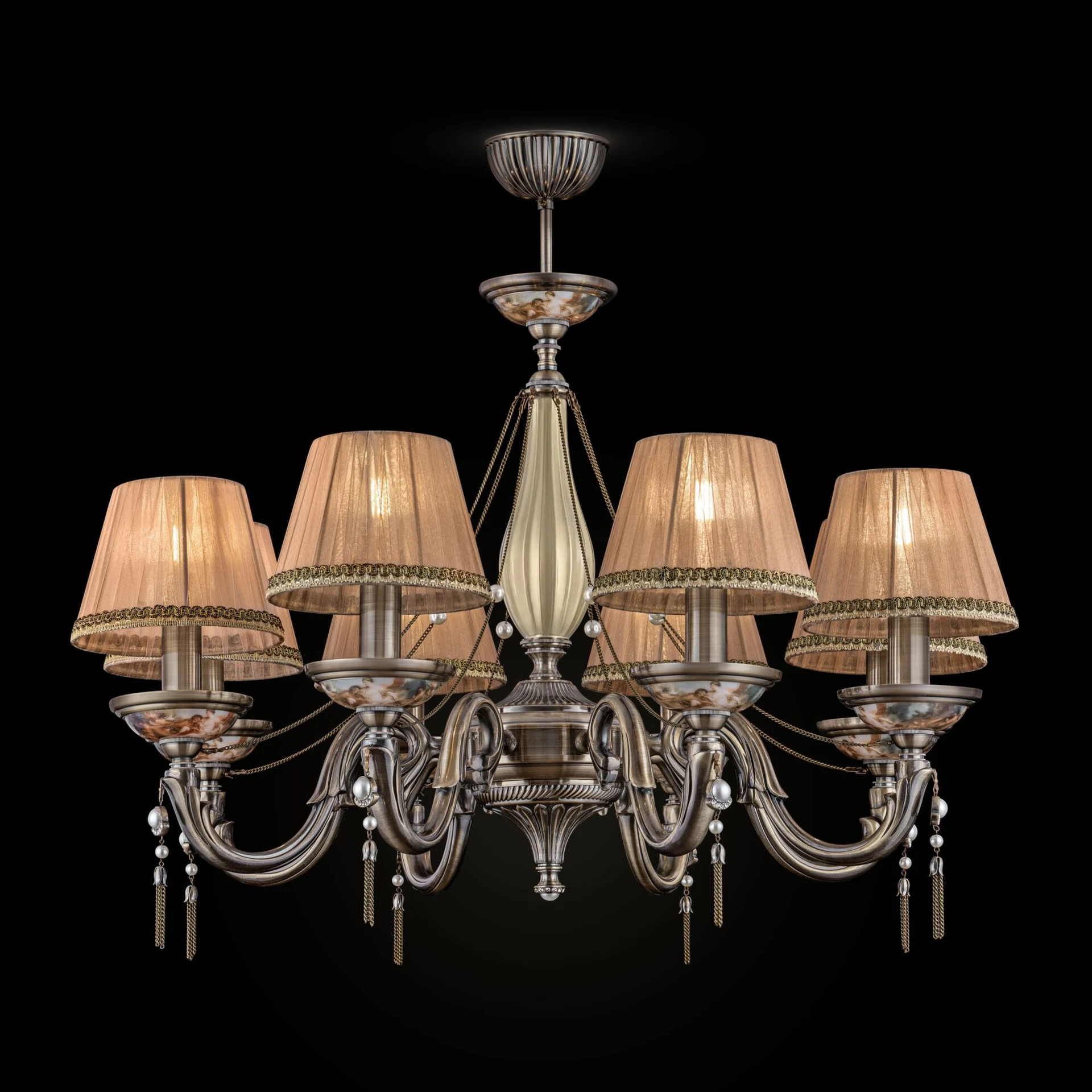 Потолочная люстра Maytoni Demitas RC024-PL-08-R от Maytoni, подходит для гостиной, для спальни, для кабинета, в стиле классика. Материал — металл, цвет бронза, плафон из органза, цвет плафона персиковый, форма плафона — круглый абажур. Модель имеет 8 ламп, цоколь E14, мощность 320 Вт. Крепление — крюк. Степень защиты IP20. Габариты: высота 930 мм, ширина 770 мм, диаметр 770 мм. Декор — хрустальные подвески, коллекция Demitas.