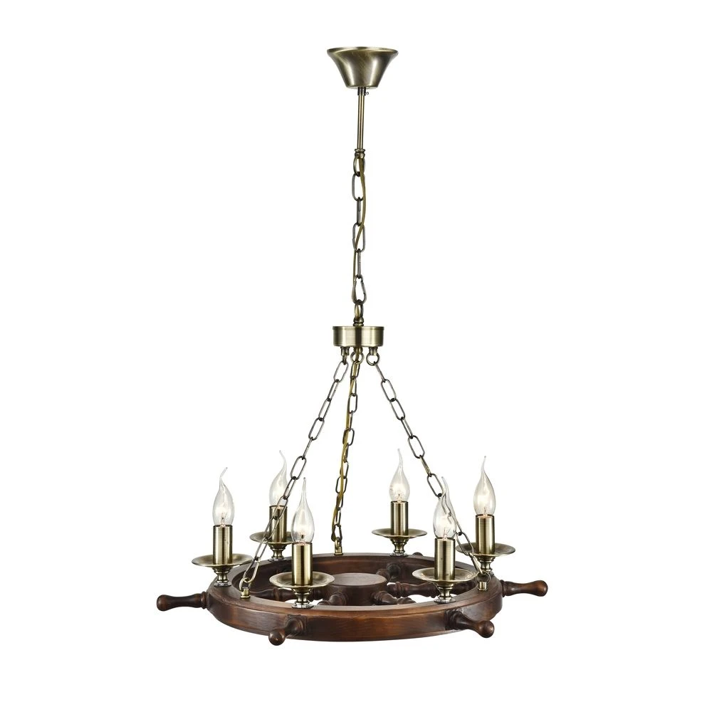 Люстра штурвал Frigate ARM624-06-R Maytoni от Maytoni, подходит для кухни, для гостиной, для спальни, для детской, в стиле морской. Материал — железо, цвет бронза, форма плафона — свечи. Модель имеет 6 ламп, цоколь E14, мощность 60 Вт. Крепление — крюк. Степень защиты IP20. Габариты: высота 730 мм, ширина 600 мм, диаметр 600 мм. Декор — штурвал, коллекция Frigate.