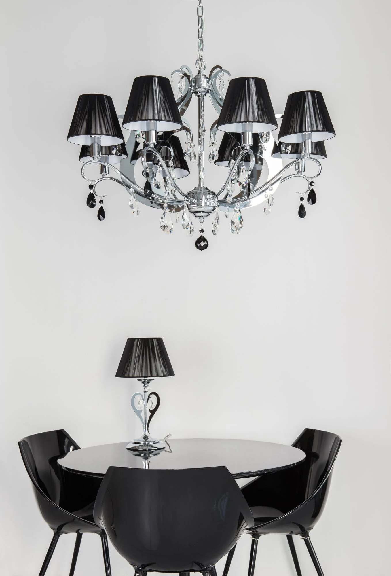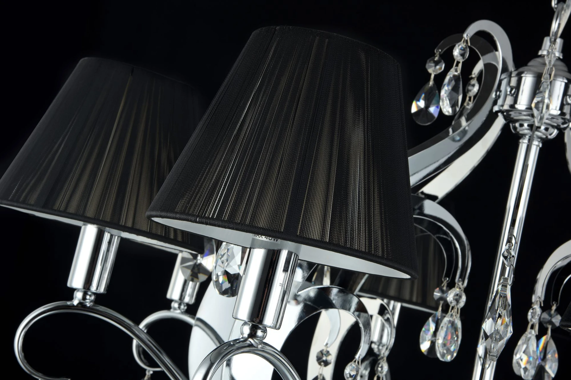 Подвесная люстра Maytoni Mina MOD900-PL-08-N от Maytoni, подходит для гостиной, для спальни, в стиле классика. Материал — металл, цвет никель, плафон из органза, цвет плафона черный, форма плафона — абажуры. Модель имеет 8 ламп, цоколь E14, мощность 320 Вт. Крепление — крюк. Степень защиты IP20. Габариты: высота 1060 мм, ширина 800 мм, диаметр 800 мм. Декор — хрустальные подвески, коллекция Mina.