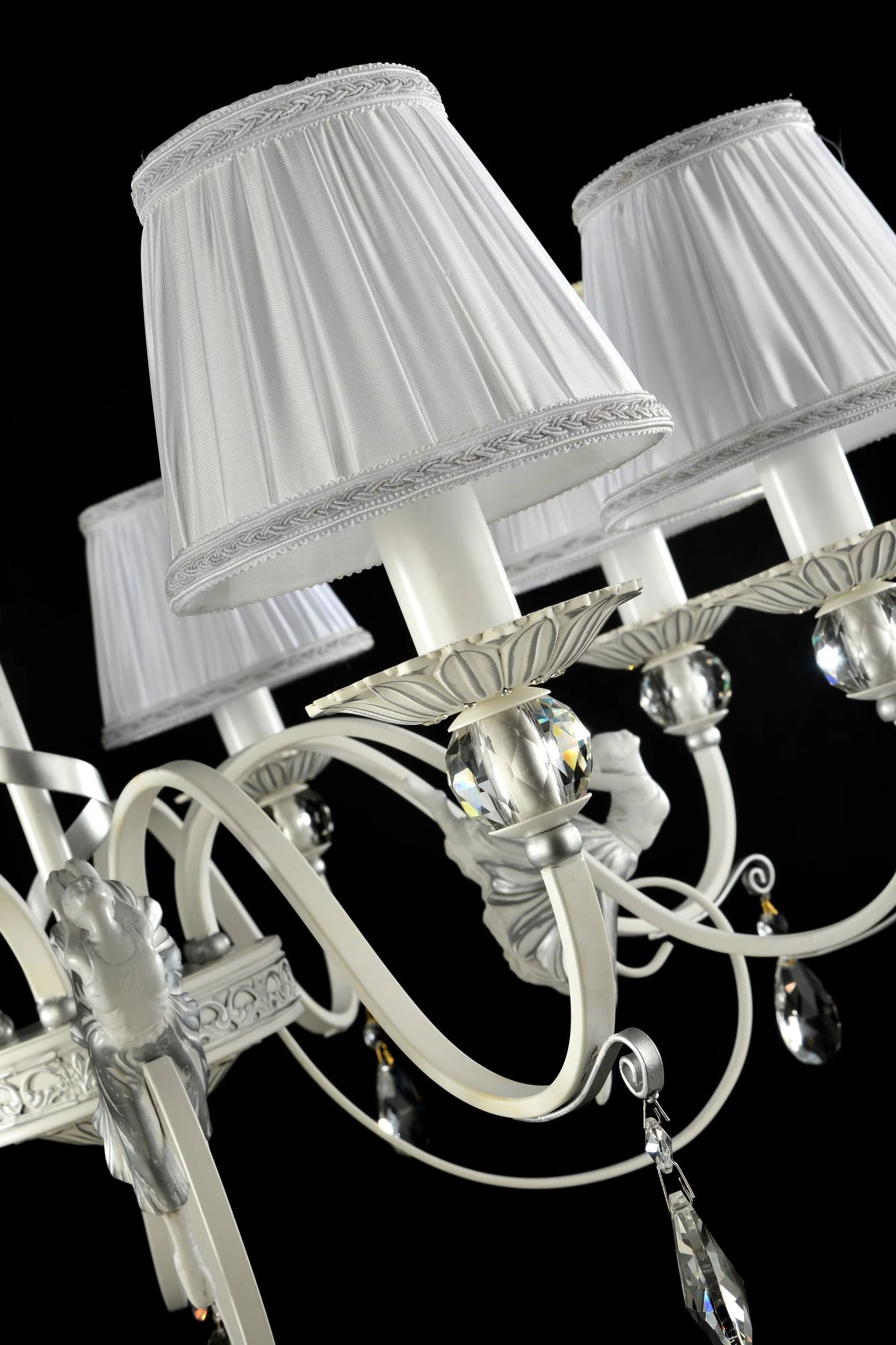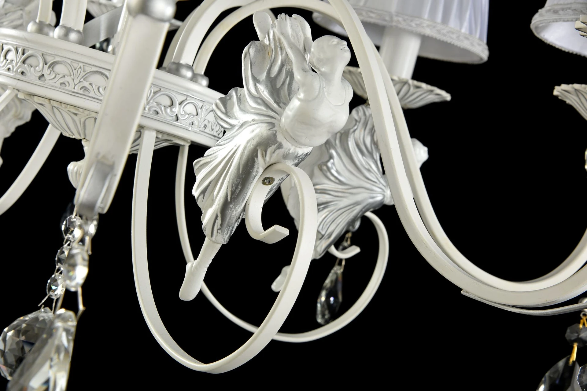 Подвесная люстра Maytoni Elina ARM222-08-N от Maytoni, подходит для гостиной, для спальни, в стиле классика. Материал — металл, цвет серебро, плафон из органза, цвет плафона белый, форма плафона — абажуры. Модель имеет 8 ламп, цоколь E14, мощность 320 Вт. Крепление — крюк. Степень защиты IP20. Габариты: высота 910 мм, ширина 760 мм, диаметр 760 мм. Декор — хрустальные подвески, коллекция Elina.