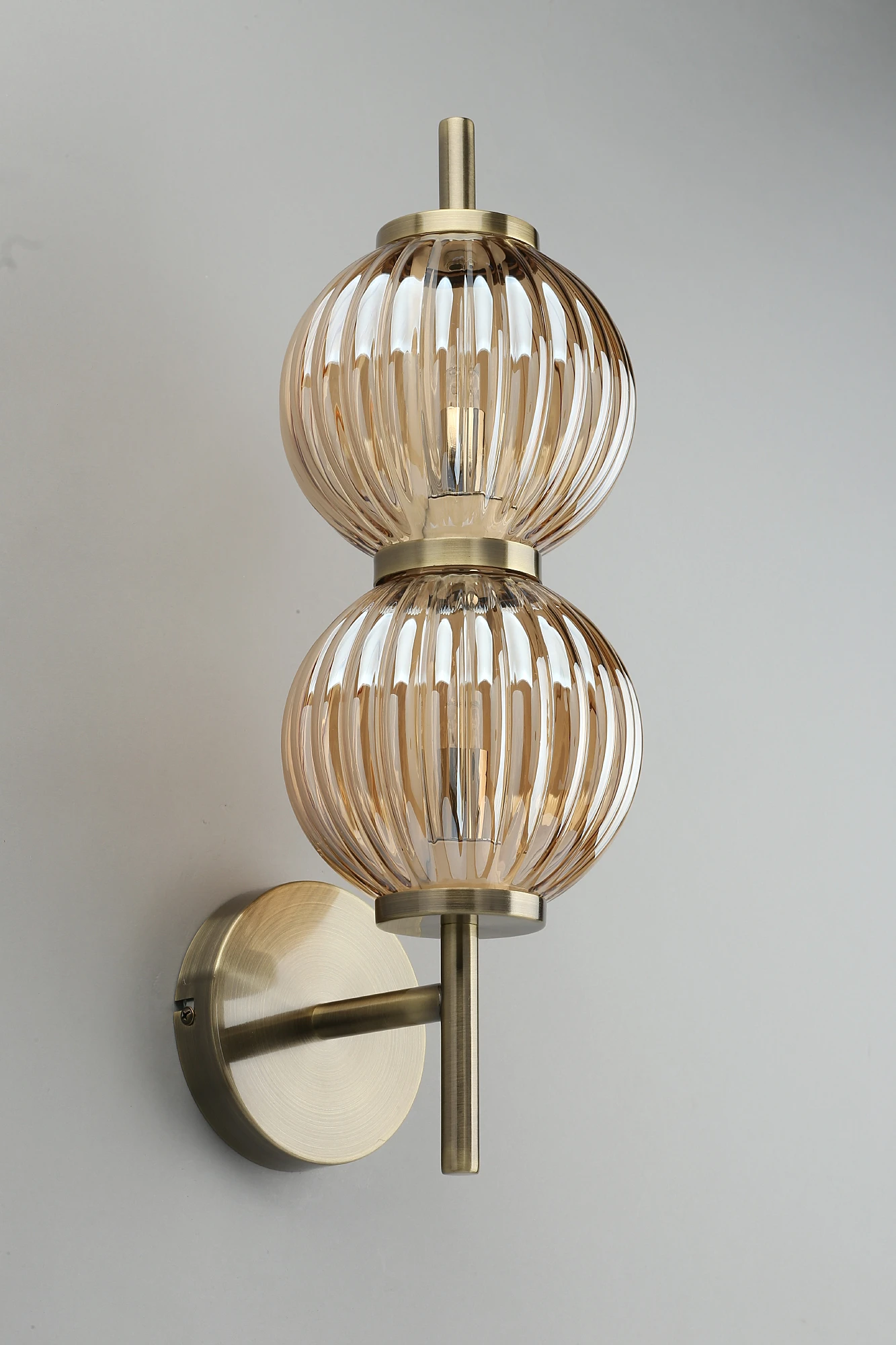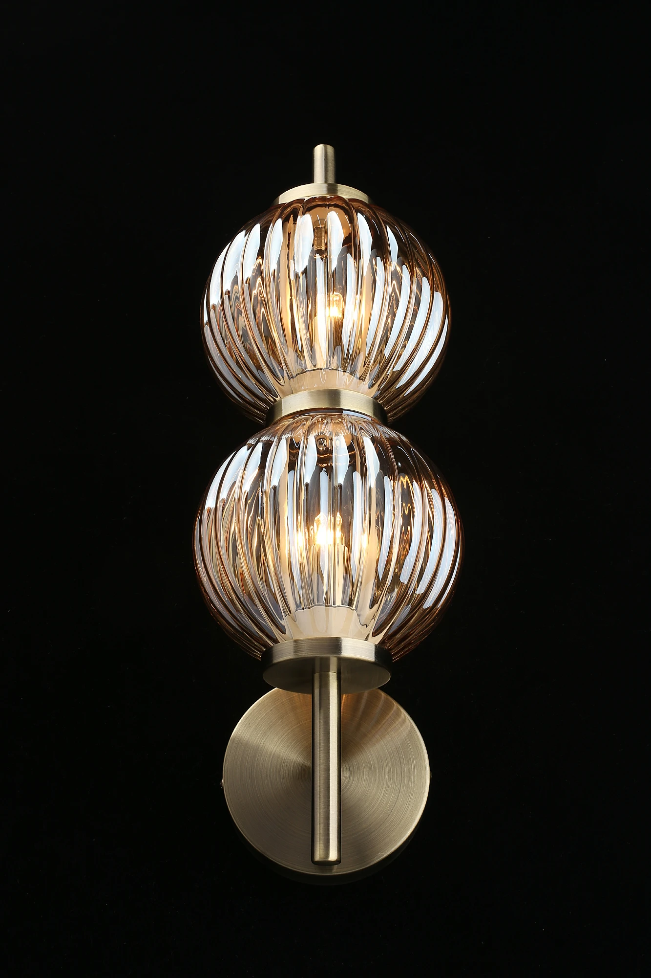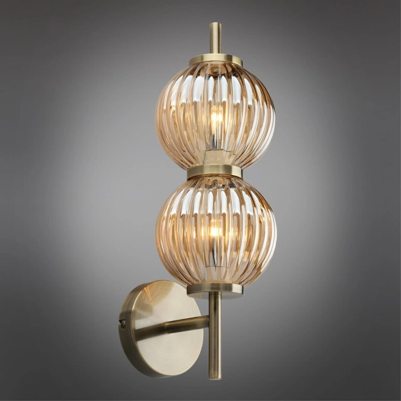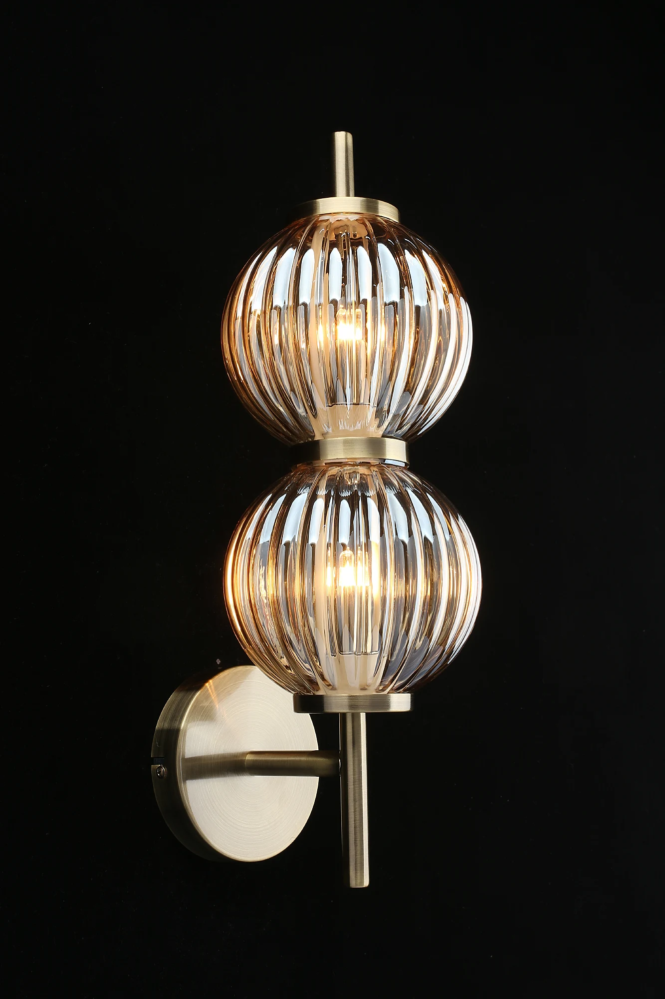 Настенное бра Aployt Zhizel APL.608.21.02 от Aployt, подходит для кухни, для спальни, в стиле современный, арт-деко. Материал — металл, цвет бронза, плафон из стекла, цвет плафона янтарный, форма плафона — ребристый. Модель имеет 2 лампы, цоколь G9, мощность 80 Вт. Крепление — планка. Габариты: высота 450 мм, ширина 150 мм, глубина 190 мм. Коллекция Zhizel, бра — Шары, световой поток — 840.