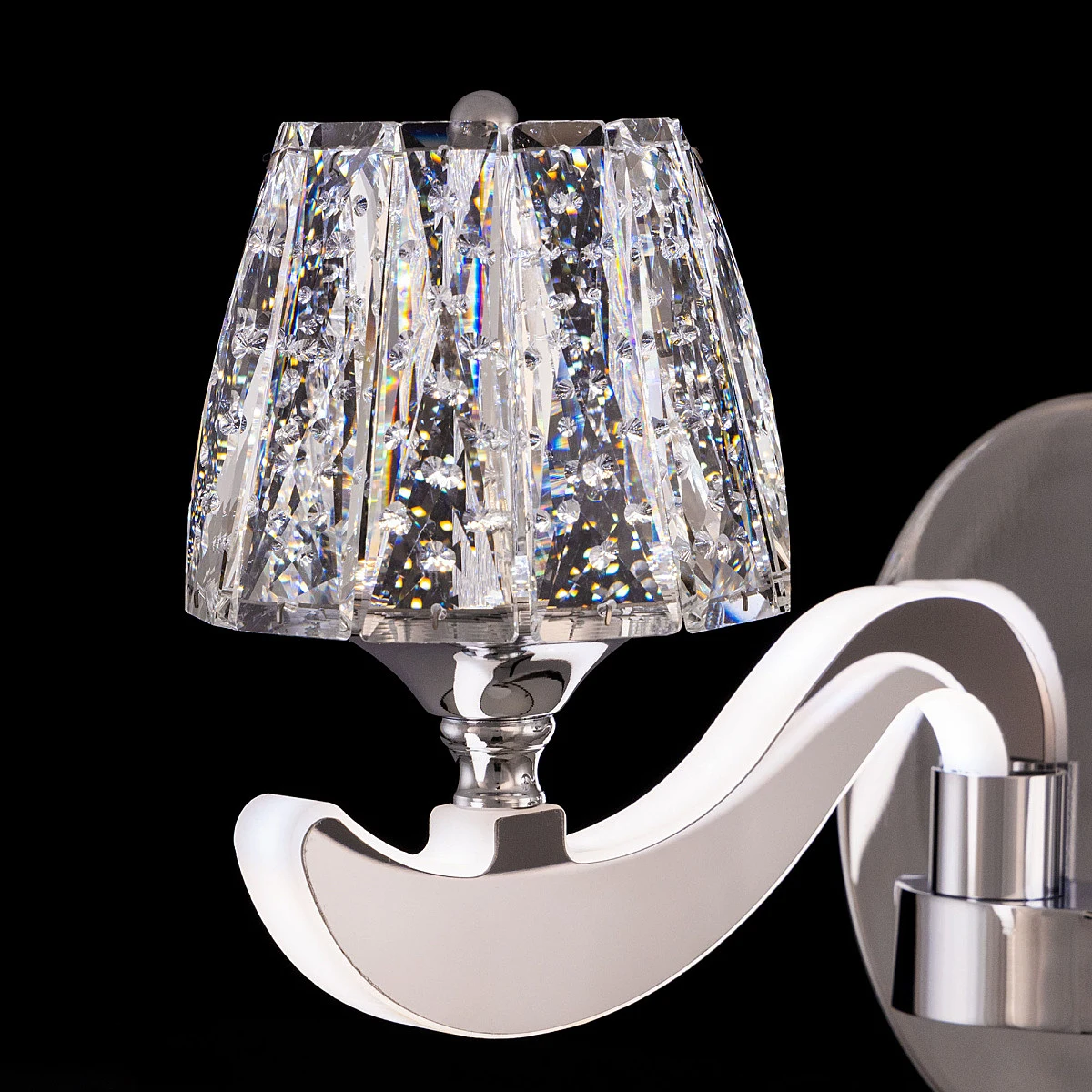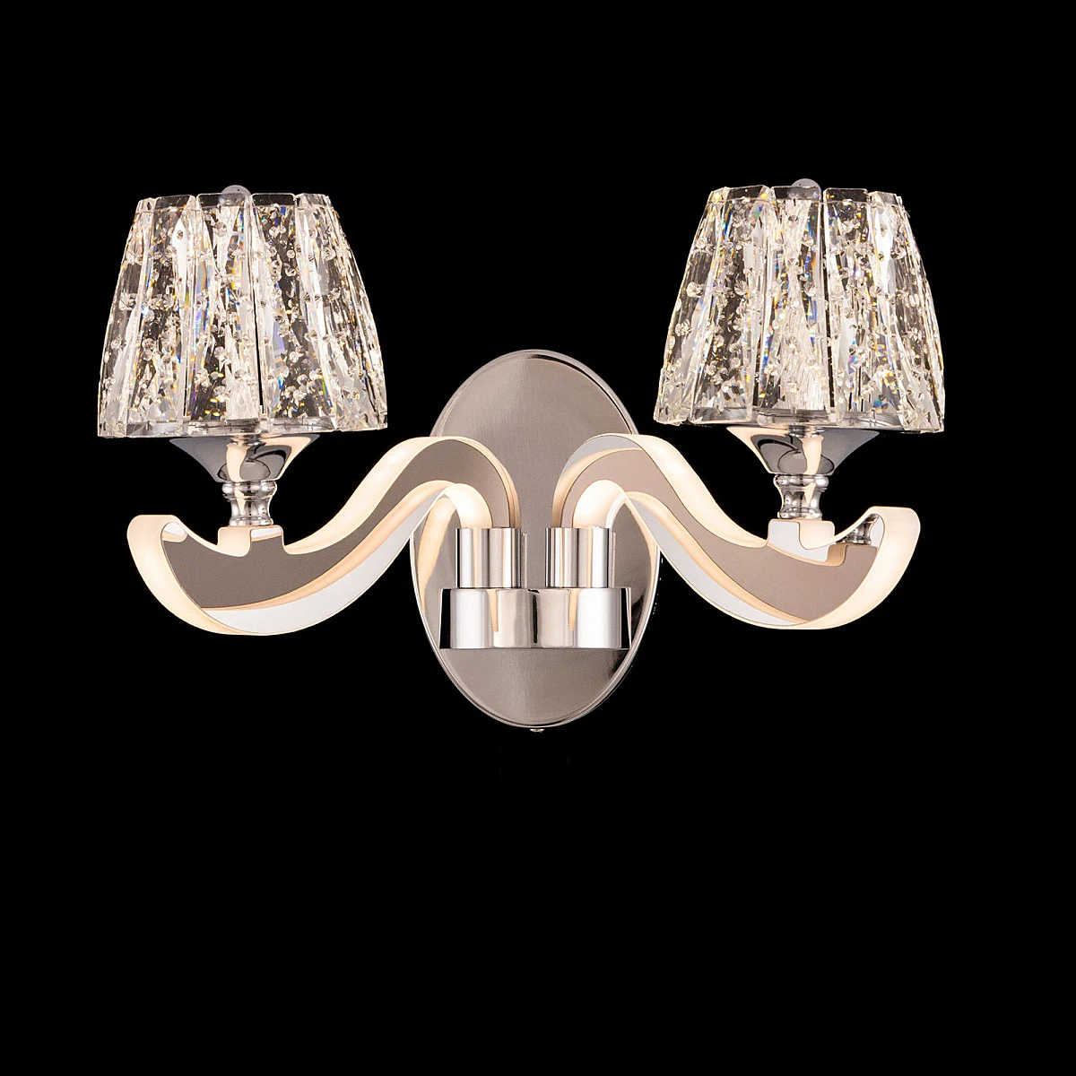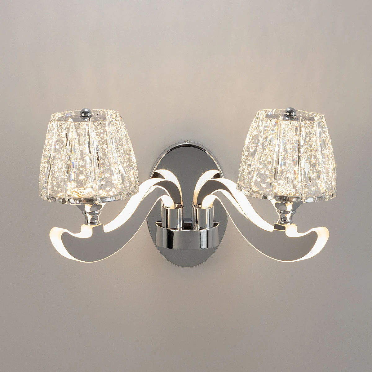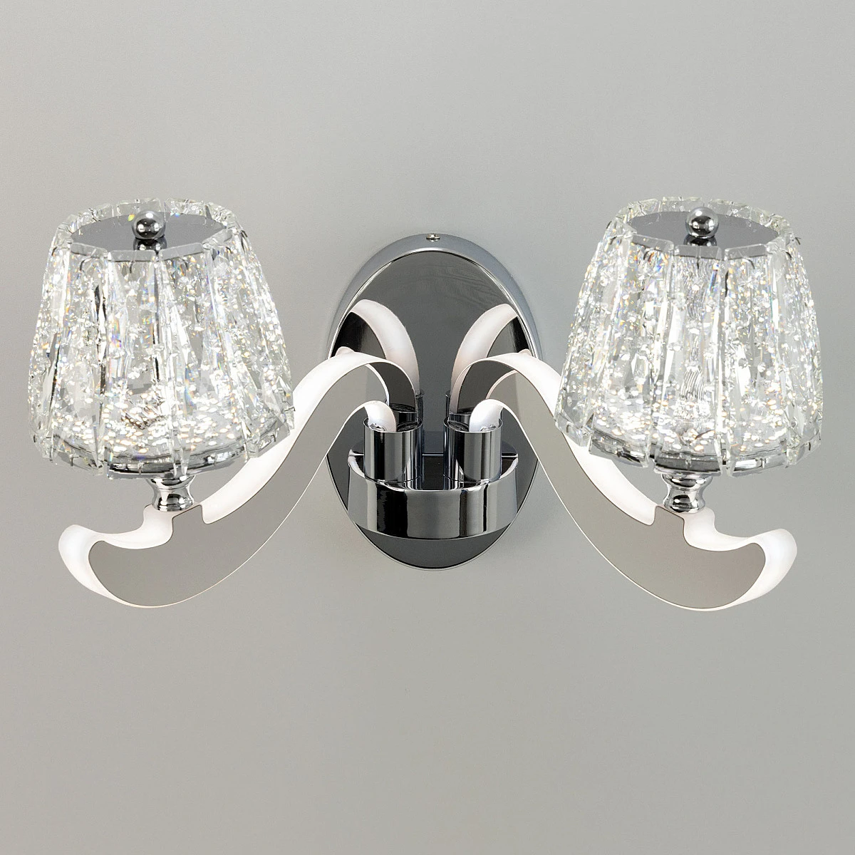 Настенное бра Citilux Montserrat EL338W2 от Citilux, подходит для гостиной, в стиле современный. Материал — металл, цвет хром, плафон из хрусталь, цвет плафона прозрачный, форма плафона — конус. Модель имеет 2 лампы, цоколь LED, мощность 20 Вт. Крепление — планка. Степень защиты IP20. Габариты: высота 250 мм, ширина 460 мм. Коллекция Montserrat, бра — Полностью светодиодная, бра — С плафонами.