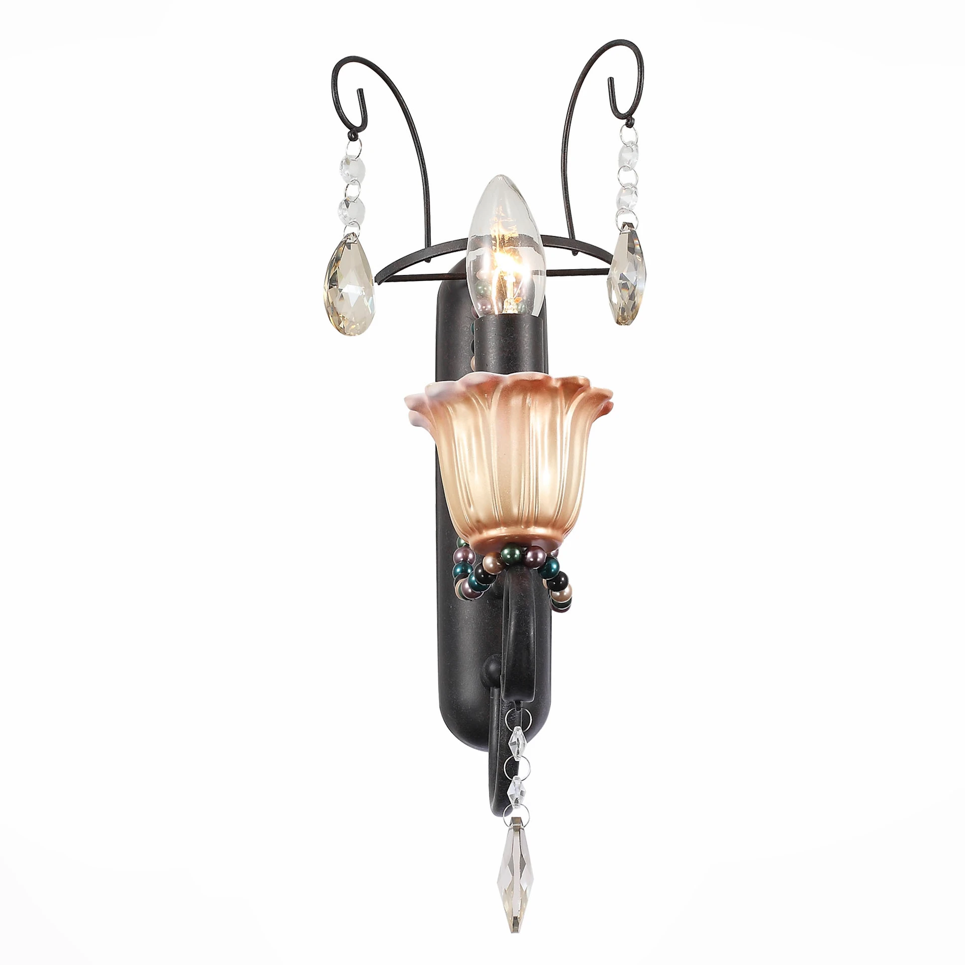 Настенное бра ST Luce SL152 SL152.401.01 от ST Luce, подходит для гостиной, в стиле кантри. Материал — металл, цвет черный, плафон из бусы, цвет плафона золото, форма плафона — свечи. Модель имеет 1 лампу, цоколь E14, мощность 40W. Габариты: высота 300 мм, ширина 160 мм, глубина 250 мм. Декор — хрустальные подвески, коллекция SL152.