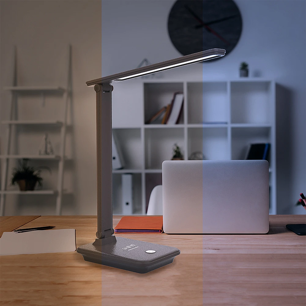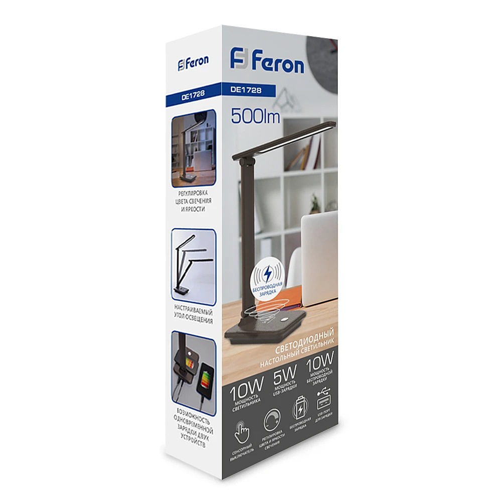 Настольная лампа Feron DE1728 41451 от Feron, подходит для кабинета, в стиле современный. Материал — пластик, цвет коричневый. Модель имеет 1 лампу, цоколь LED, мощность 25 Вт, площадь освещения до 2 кв. м. Usb разъем, выключатель на корпусе, цветовая температура 3000-6000. Габариты: высота 320 мм, ширина 170 мм. Коллекция DE1728, примечание — Мощность свет. 10 Вт + 10Вт беспроводная зарядка +, световой поток — 500.