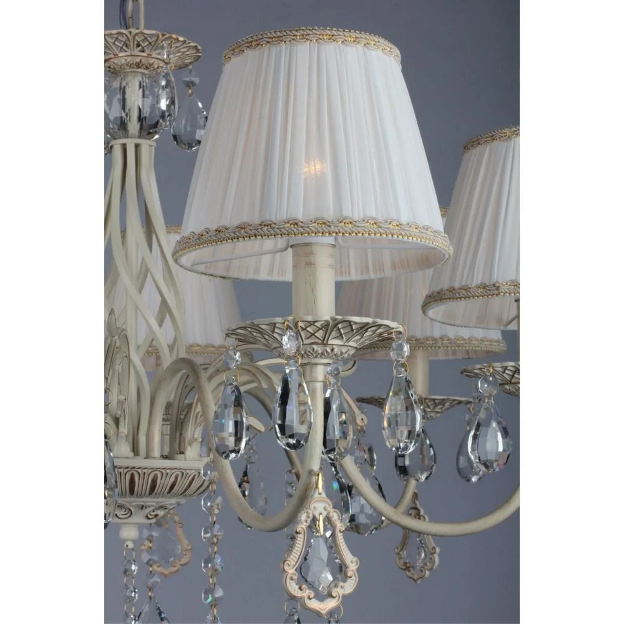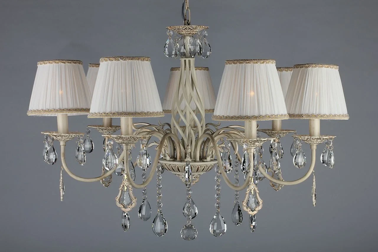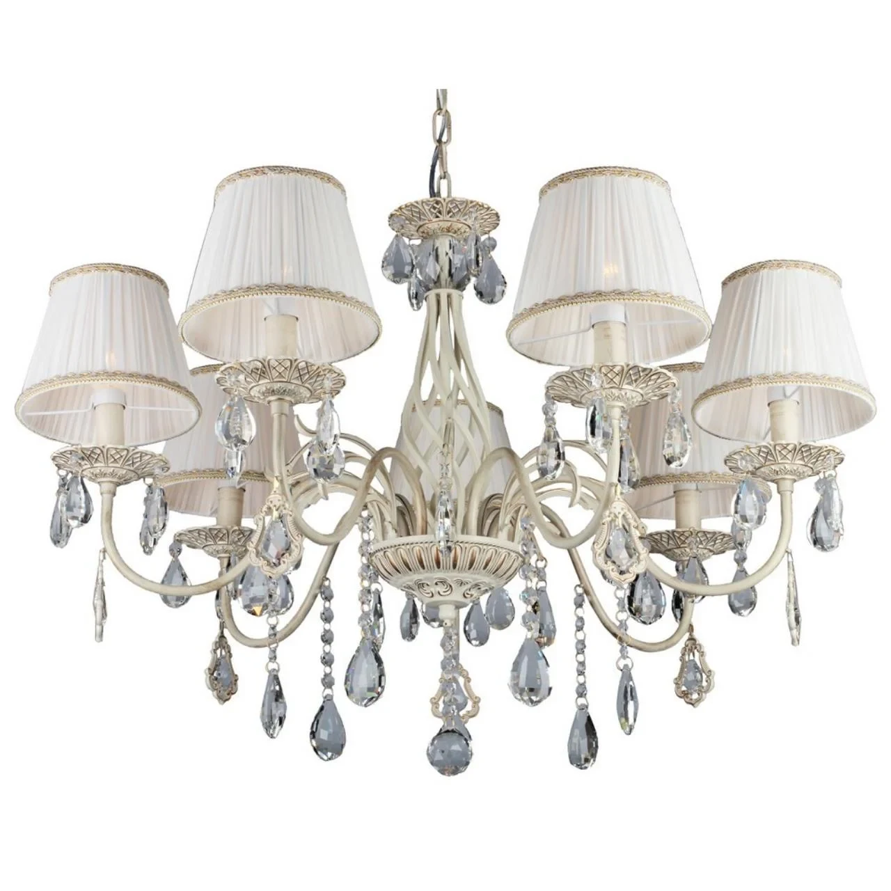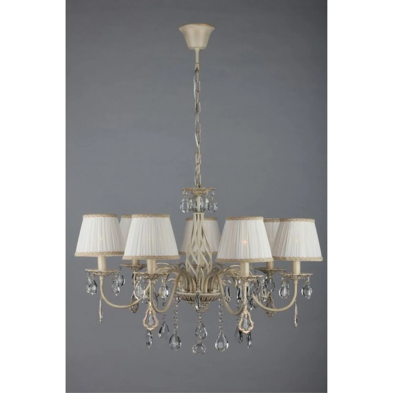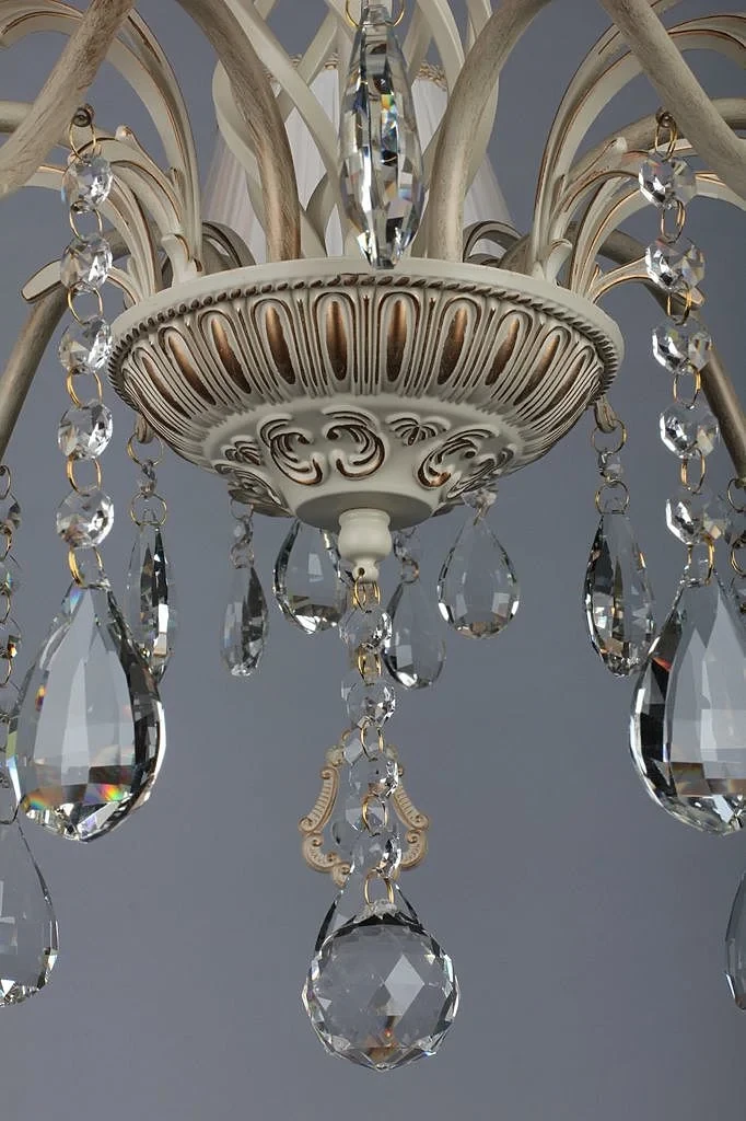 Подвесная люстра Omnilux Cremona OML-60803-07 от Omnilux, подходит для спальни, в стиле прованс. Материал — металл, цвет белое золото, плафон из ткань, цвет плафона белый, форма плафона — круглый абажур. Модель имеет 7 ламп, цоколь E14. Габариты: высота 1050 мм, ширина 800 мм, диаметр 800 мм. Декор — хрустальные подвески.