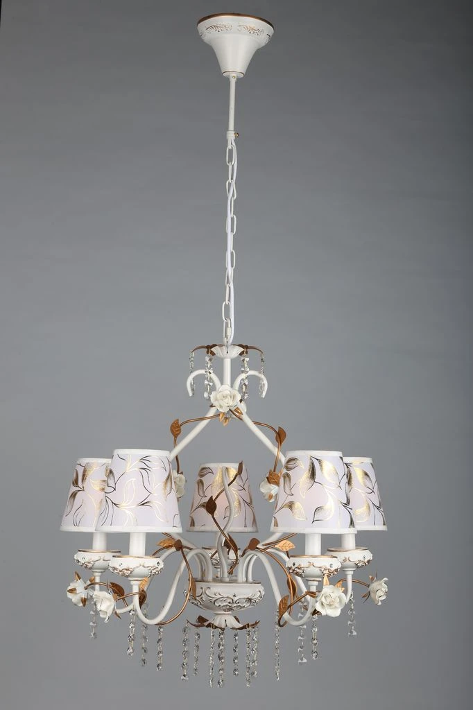 Люстра подвесная с цветочками Lucca OML-77903-05 Omnilux от Omnilux, подходит для спальни, в стиле флористика. Материал — металл, цвет белый, плафон из ткань, форма плафона — круглый абажур. Модель имеет 5 ламп, цоколь E14, мощность 40W. Направление света — вверх. Габариты: высота 1150 мм, ширина 700 мм, диаметр 700 мм. Декор — хрустальные подвески, коллекция Lucca.