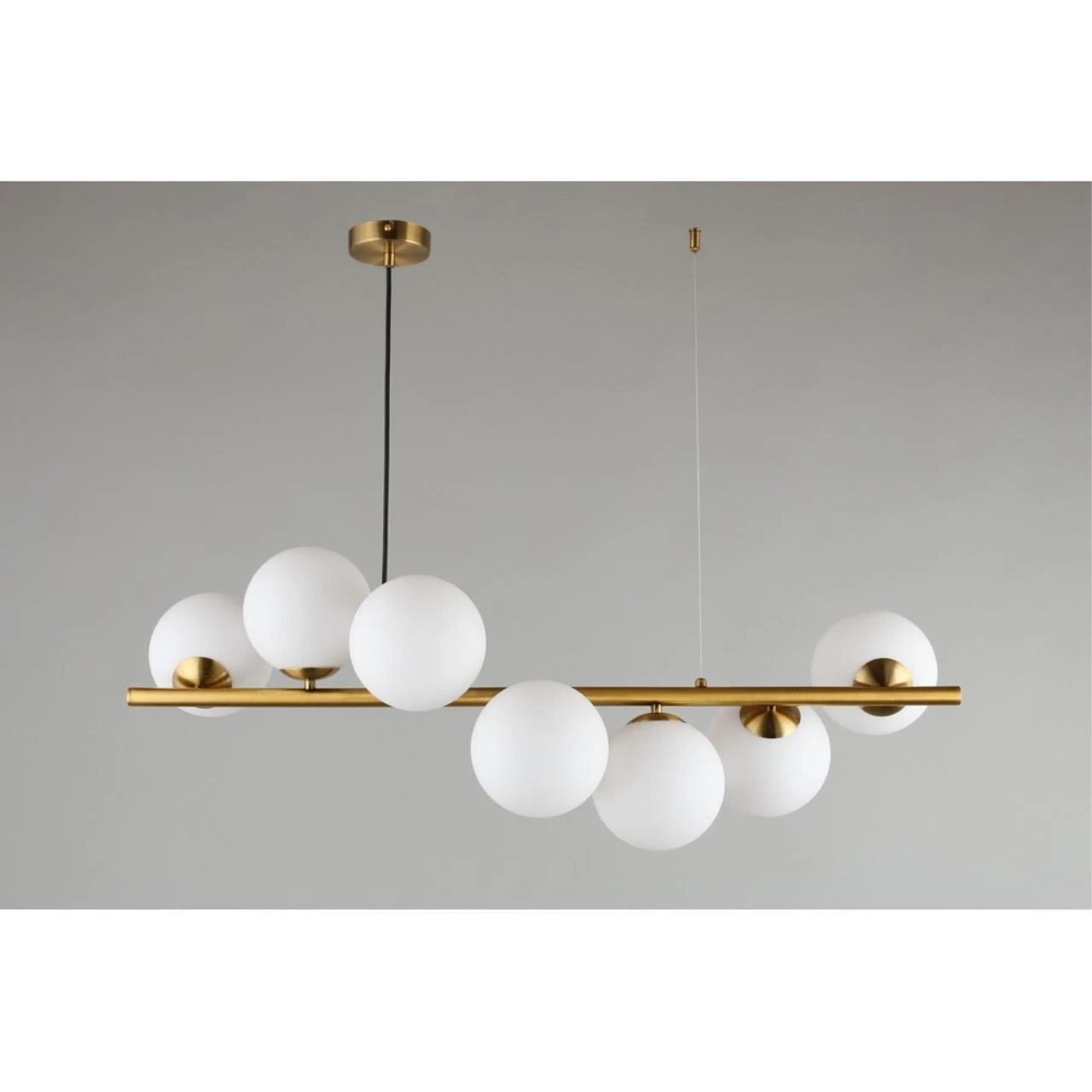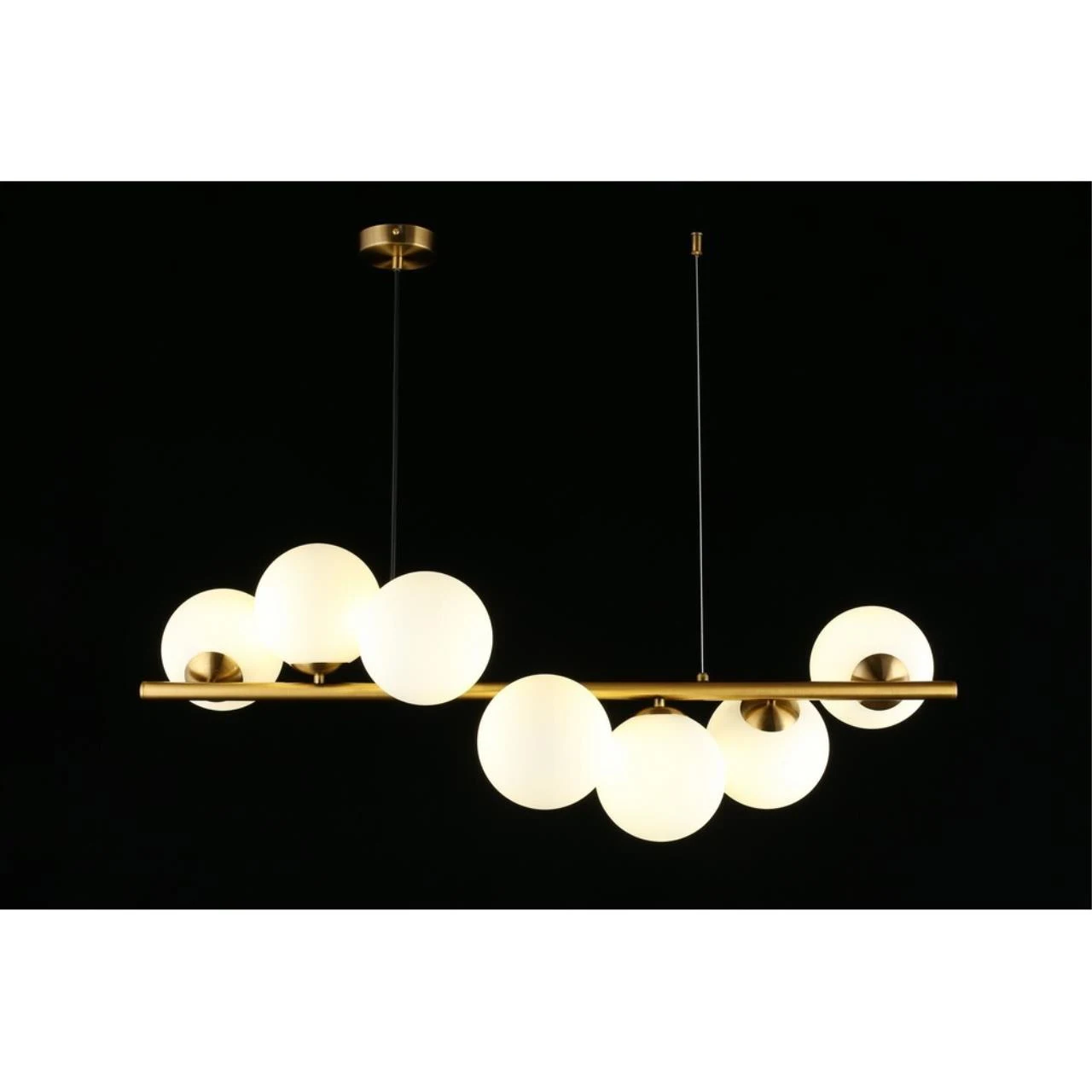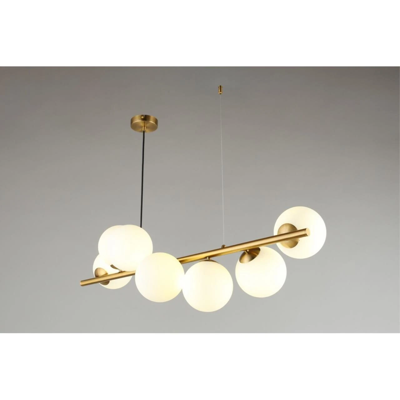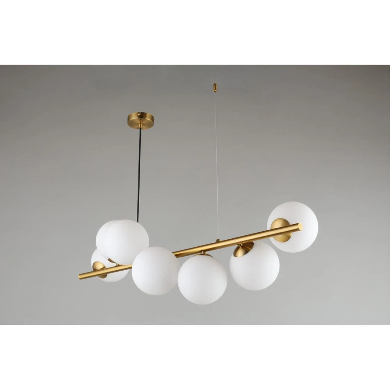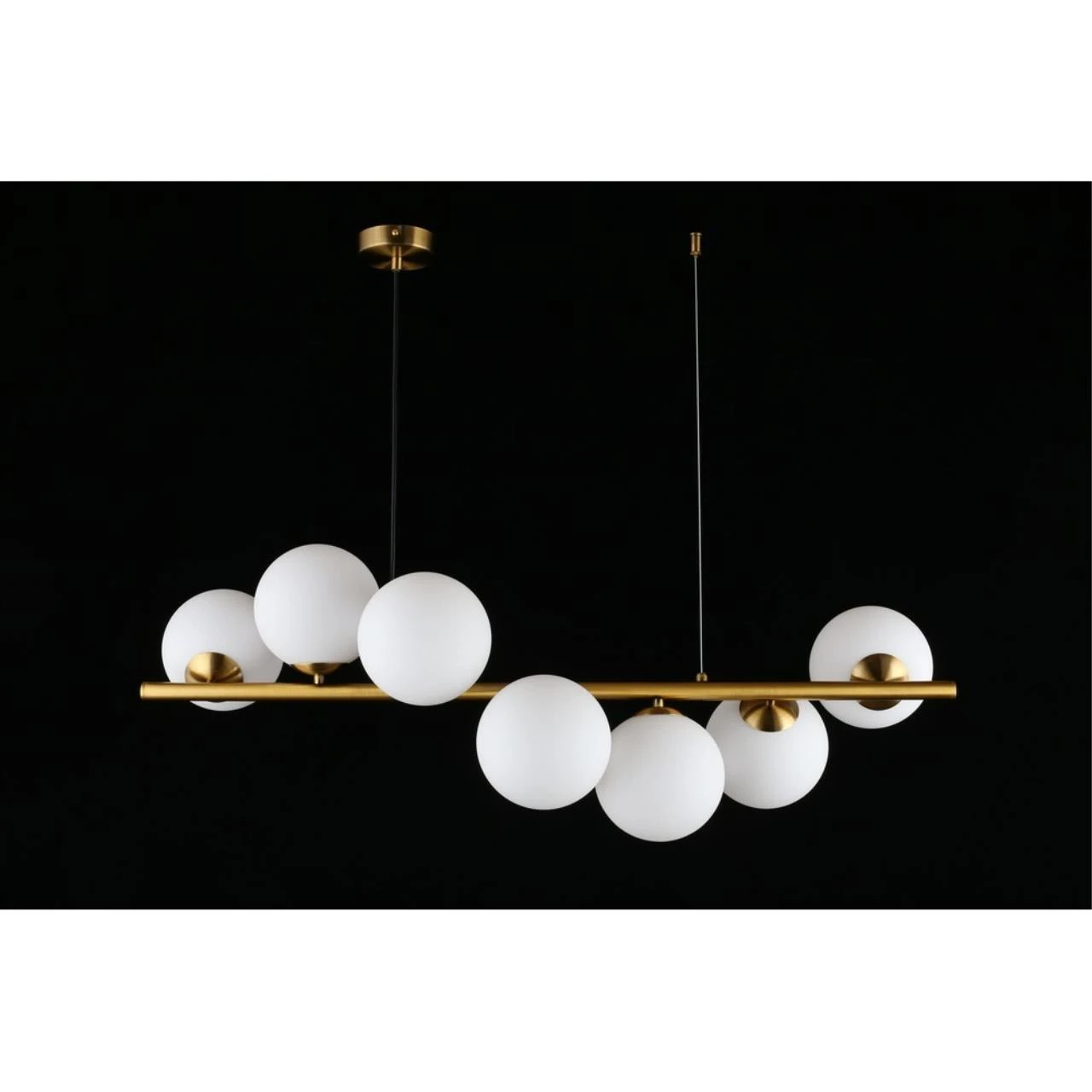 Подвесная люстра Aployt Jagna APL.312.13.07 от Aployt, подходит для гостиной, для спальни, в стиле современный. Материал — металл, цвет латунь, плафон из стекла, цвет плафона белый, форма плафона — шар. Модель имеет 7 ламп, цоколь G9, мощность 35 Вт. Направление света — равномерное, крепление — планка. Габариты: высота 1300 мм, ширина 350 мм. Коллекция Jagna, световой поток — 1925.