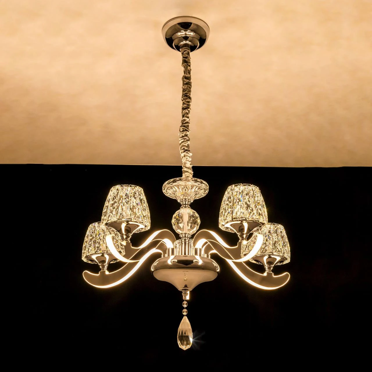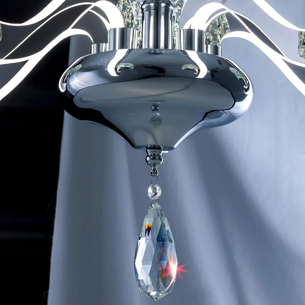 Подвесная люстра с пультом Montserrat Citilux EL338P05 от Citilux, подходит для гостиной, в стиле современный. Материал — металл, цвет хром, плафон из акрил, цвет плафона белый, форма плафона — конус. Модель имеет 1 лампу, цоколь LED, мощность 60 Вт. Габариты: высота 1200 мм, ширина 600 мм, диаметр 600 мм. Декор — хрустальные подвески.