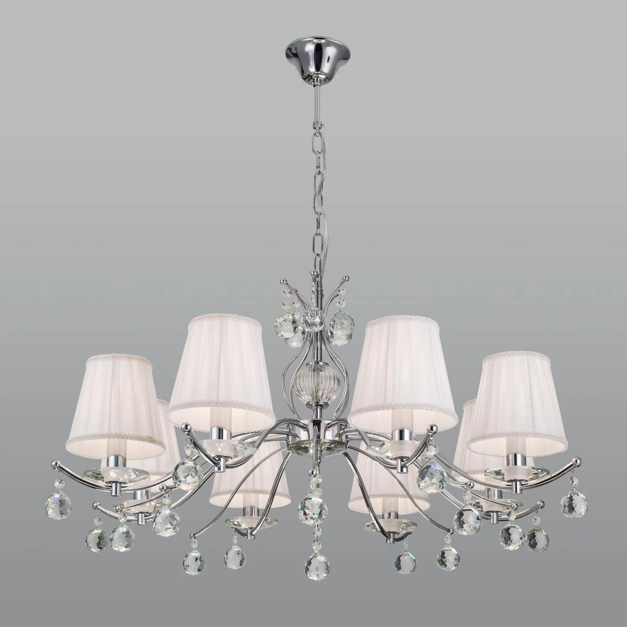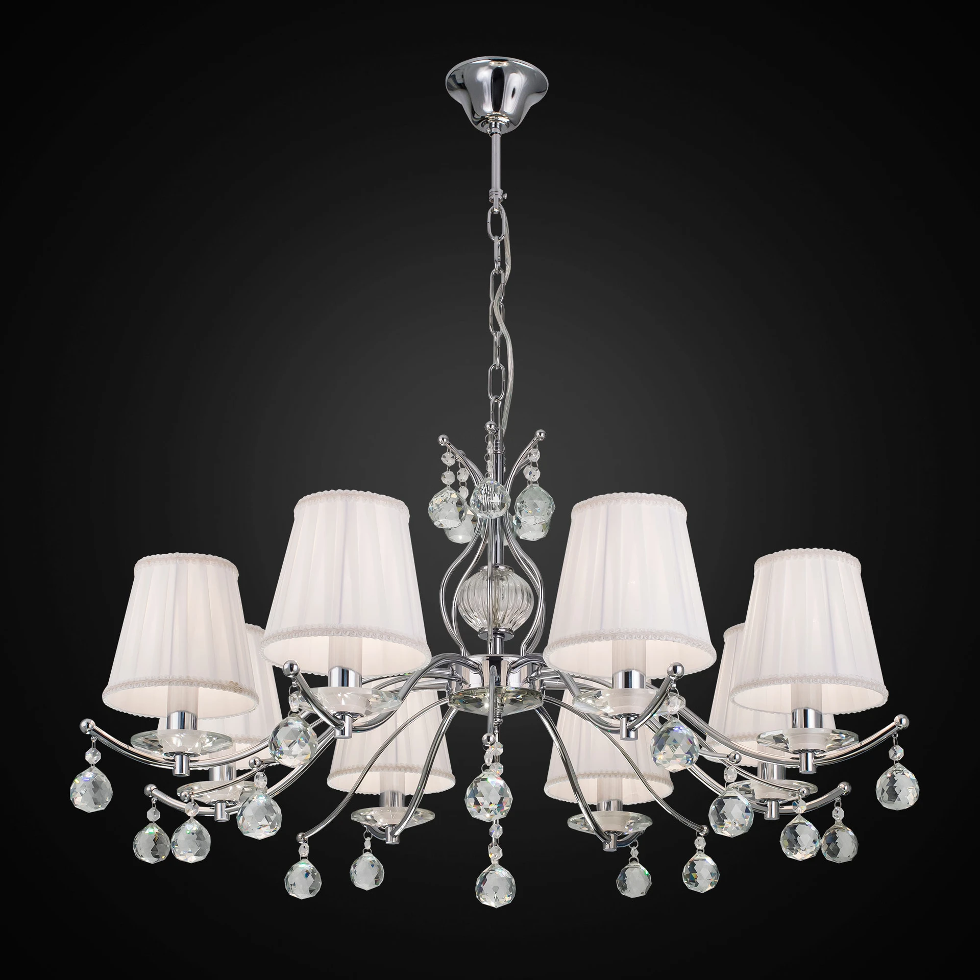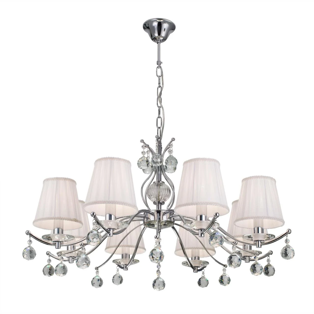 Подвесная люстра Citilux Шелли CL438181 от Citilux, подходит для спальни, в стиле современный. Материал — металл, цвет хром, плафон из текстиль, цвет плафона белый, форма плафона — круглый абажур. Модель имеет 8 ламп, цоколь E14, мощность 40 Вт. Габариты: высота 1200 мм, ширина 850 мм, диаметр 850 мм. Декор — хрустальные подвески.