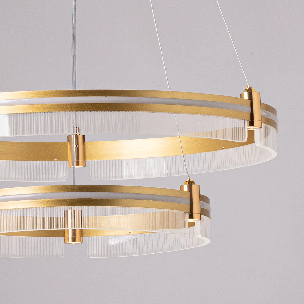 Металлическое основание светильника гальванизировано в цвет золота. Корпус плафона выполнен из сплава алюминия с цинком и обработан по технологии порошкового окрашивания в цвет матового золота. Светодиодные источники света закрыты белым силиконом. Люстра декорирована пластинами из прозрачного акрила с линейным рисунком.