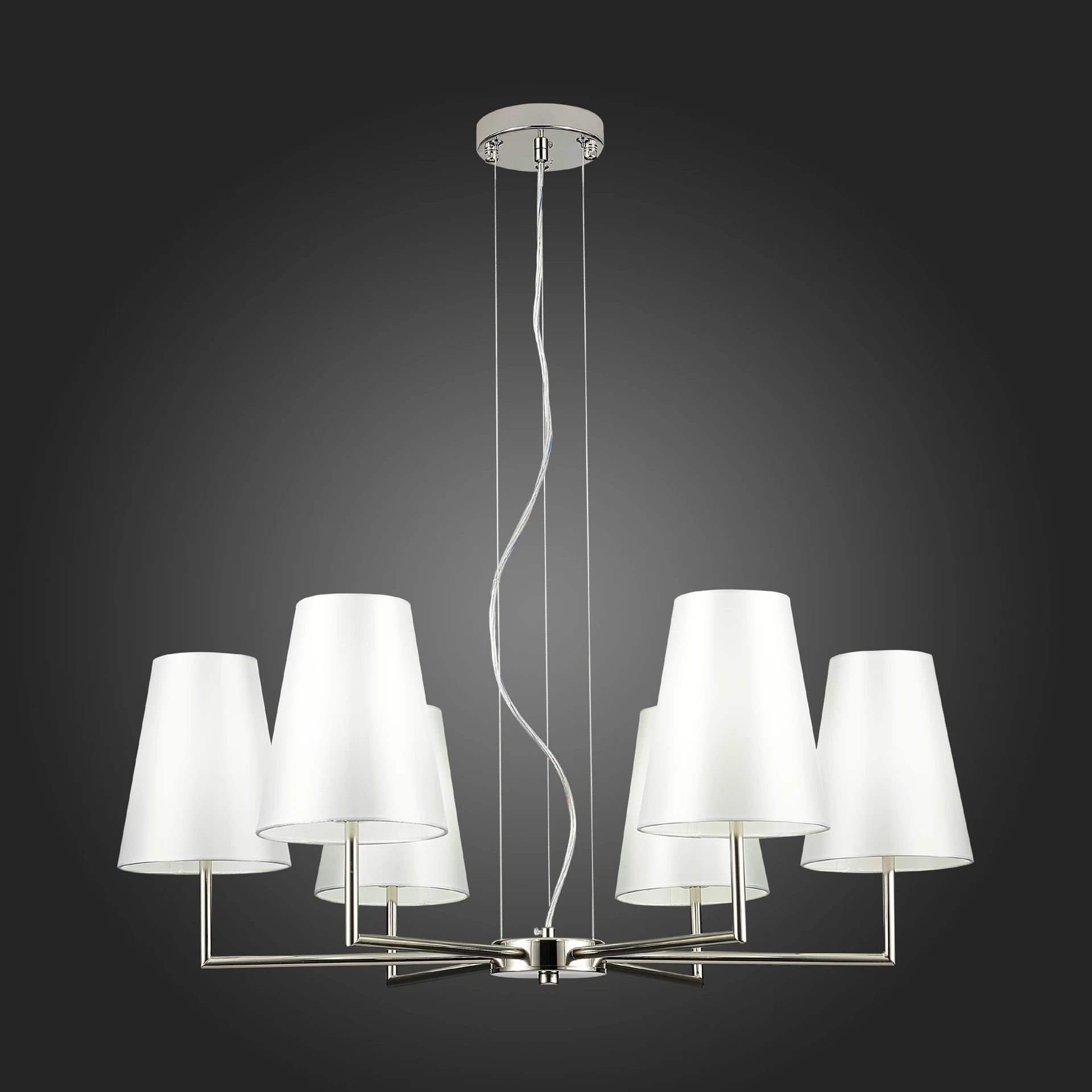 Подвесная люстра Evoluce Bellino SLE105903-06 от Evoluce, подходит для гостиной, для спальни, в стиле современный. Материал — металл, цвет никель, плафон из текстиль, цвет плафона белый, форма плафона — круглый абажур. Модель имеет 6 ламп, цоколь E14, мощность 240 Вт, площадь освещения до 12 кв. м. Крепление — планка. Габариты: высота 874 мм, ширина 813 мм, диаметр 813 мм. Коллекция Bellino.