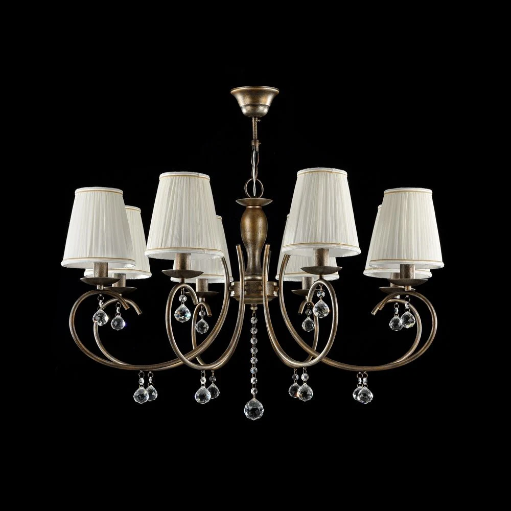 Подвесная люстра Freya Gretchen FR305-08-R от Freya, подходит для спальни, в стиле классика. Материал — кристалл, цвет черное золото, плафон из органза. Модель имеет 8 ламп, цоколь E14, мощность 40W. Крепление — крюк. Степень защиты IP20. Габариты: высота 1160 мм, ширина 817 мм, диаметр 817 мм. Коллекция Gretchen.