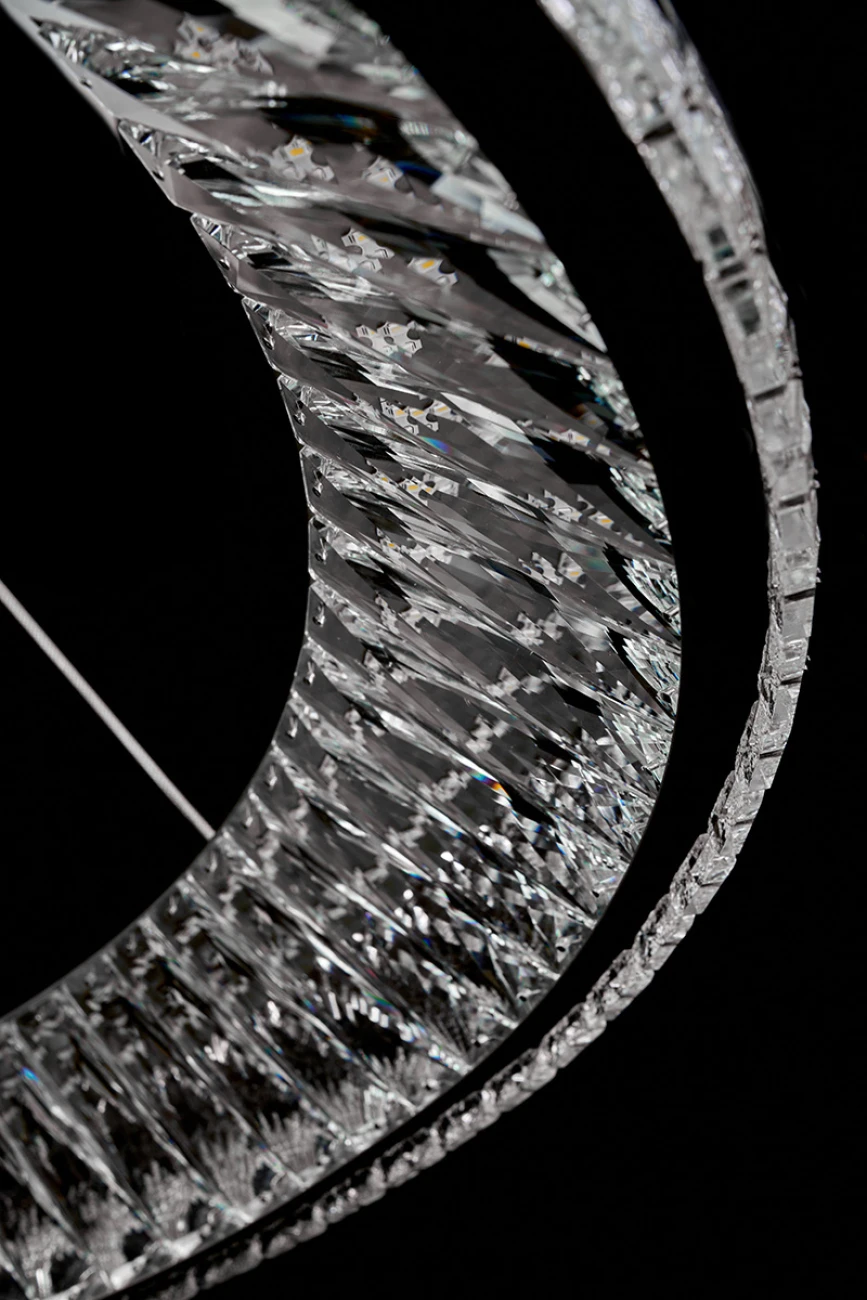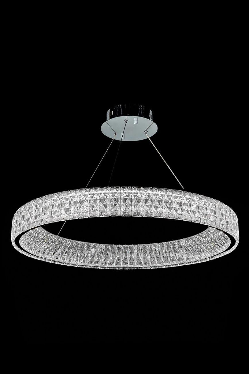 Подвесная люстра LEON Aveline LE3025/800 CH от LEON — люстры. Материал — металл гальванизированный, цвет хром, плафон из хрусталь, цвет плафона прозрачный, форма плафона — одно кольцо. Модель — цоколь LED, мощность 60 Вт. Регулировка цветовой температуры, направление света — равномерное, цветовая температура нейтральный (4000k). Габариты: высота 1500 мм, диаметр 790 мм. Коллекция Aveline, примечание — Управление через приложение., световой поток — 3300.