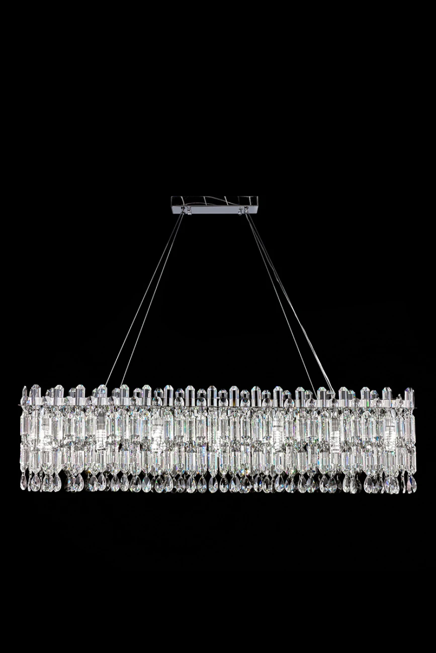 Подвесная люстра LEON Elien LE3001/1200LS CH от LEON — люстры. Материал — металл гальванизированный, цвет хром, плафон из хрусталь, цвет плафона прозрачный, форма плафона — длинные. Модель имеет 21 ламп, цоколь E14. Направление света — вниз. Габариты: высота 1515 мм, ширина 300 мм. Коллекция Elien.