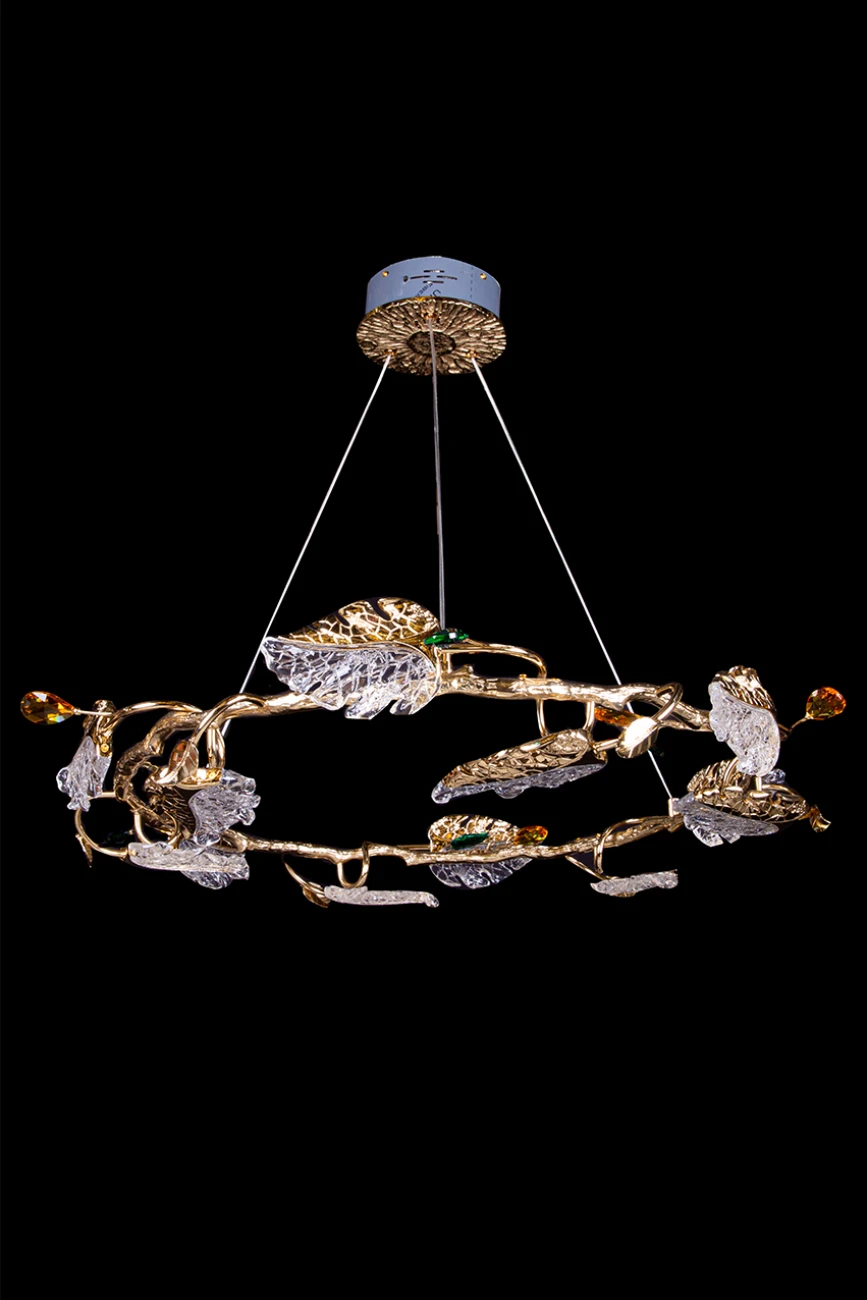 Подвесная люстра LEON Olivia LE3037/800 GD от LEON — люстры. Материал — металл гальванизированный, цвет золото, плафон из высококачественный акрил, цвет плафона прозрачный, форма плафона — круглые. Модель — цоколь LED, мощность 60 Вт. Направление света — равномерное, цветовая температура 3000. Габариты: высота 1000 мм, диаметр 800 мм. Декор — лепестки, ветки, коллекция Olivia, световой поток — 3600.