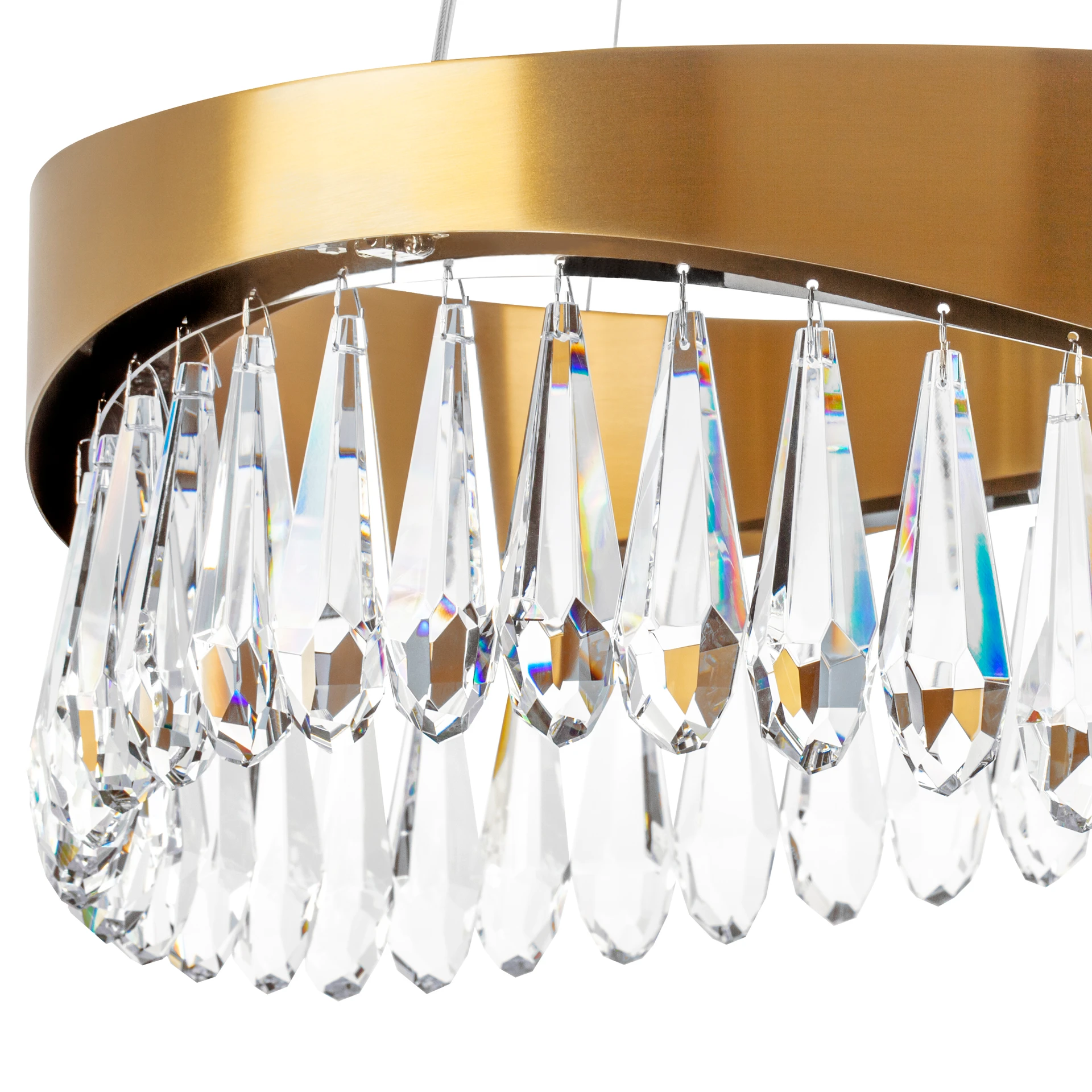 Подвесная люстра Lightstar Helio 703143 от Lightstar, подходит для спальни, в стиле классика. Материал — металл, цвет золото, цвет плафона золото. Модель имеет 1 лампу, цоколь LED, мощность 27 Вт. Цветовая температура 3500, крепление — планка. Степень защиты IP20. Габариты: высота 1500 мм, ширина 450 мм, диаметр 450 мм. Декор — хрустальные подвески, коллекция Helio, срок службы, ч — 20000, срок службы — 20000.