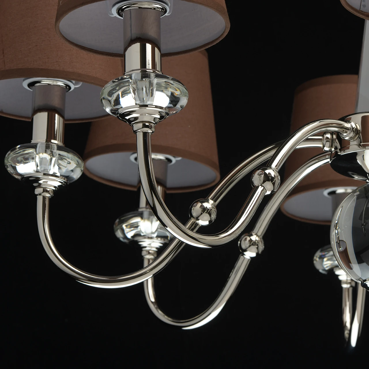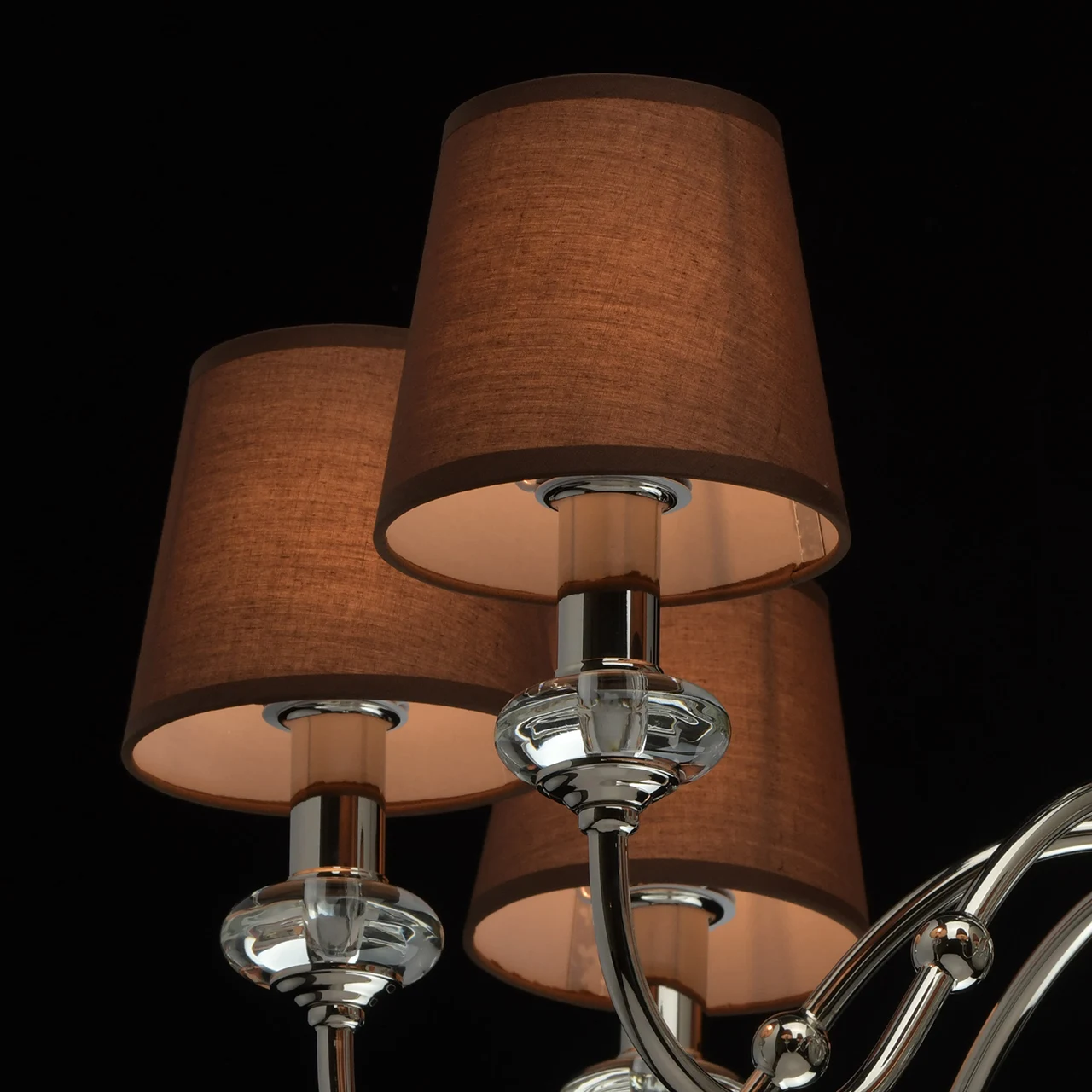 Подвесная люстра MW Light София 355013608 от MW-Light, подходит для гостиной, в стиле современный. Материал — металл, цвет хром, плафон из текстиль, цвет плафона коричневый, форма плафона — круглый абажур. Модель имеет 8 ламп, цоколь E14, мощность 40 Вт, площадь освещения до 16 кв. м. Направление света — вверх. Габариты: высота 1450 мм, ширина 800 мм, диаметр 800 мм. Коллекция София.