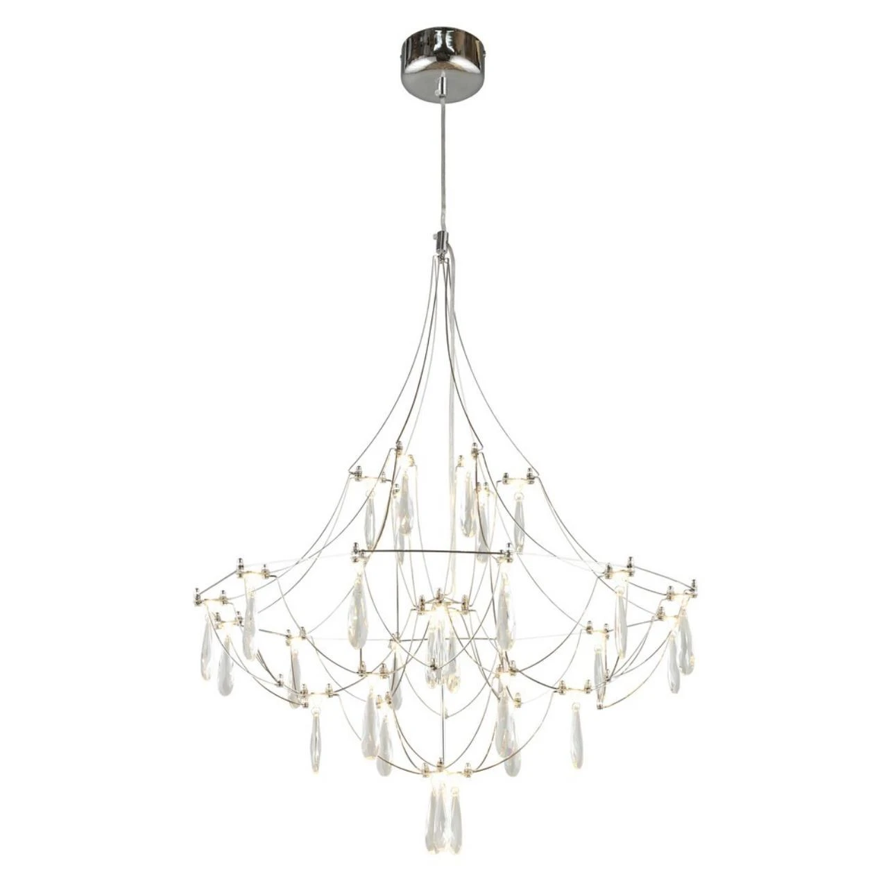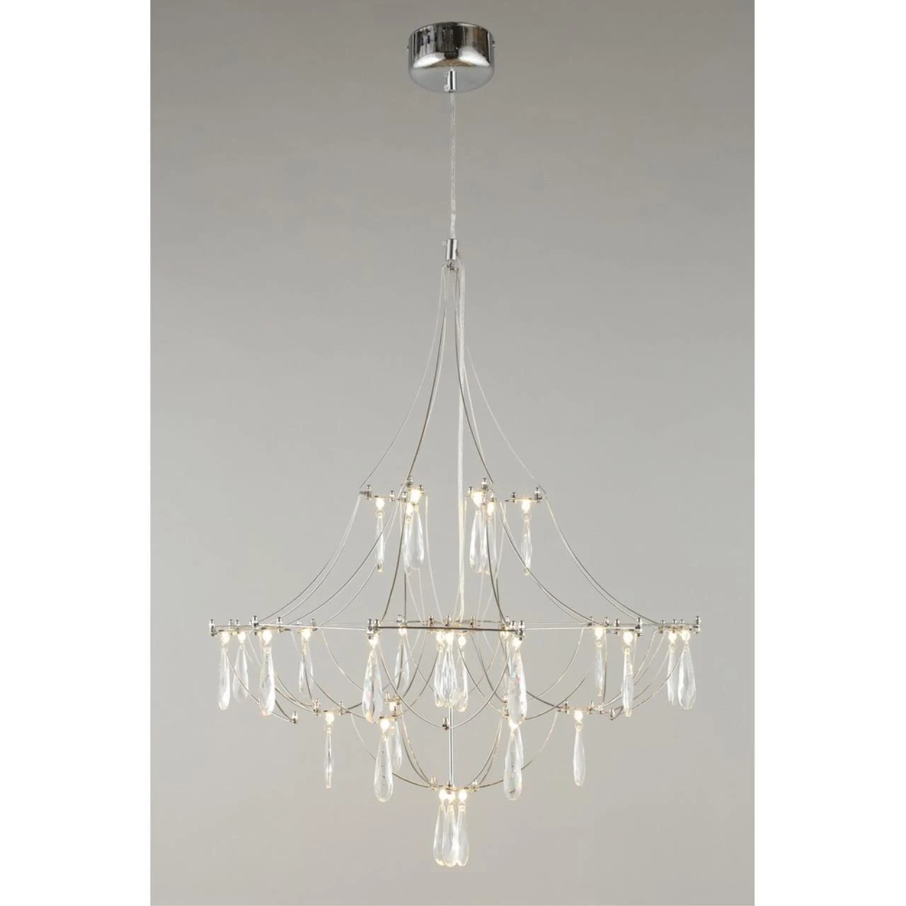 Подвесная люстра Omnilux Perelli OML-29603-30 от Omnilux — люстры. Материал — металл, цвет хром. Модель имеет 1 лампу, цоколь LED, мощность 17 Вт. Направление света — равномерное, крепление — планка. Габариты: высота 1700 мм, ширина 600 мм, диаметр 600 мм. Декор — хрустальные подвески, коллекция Perelli, световой поток — 935.