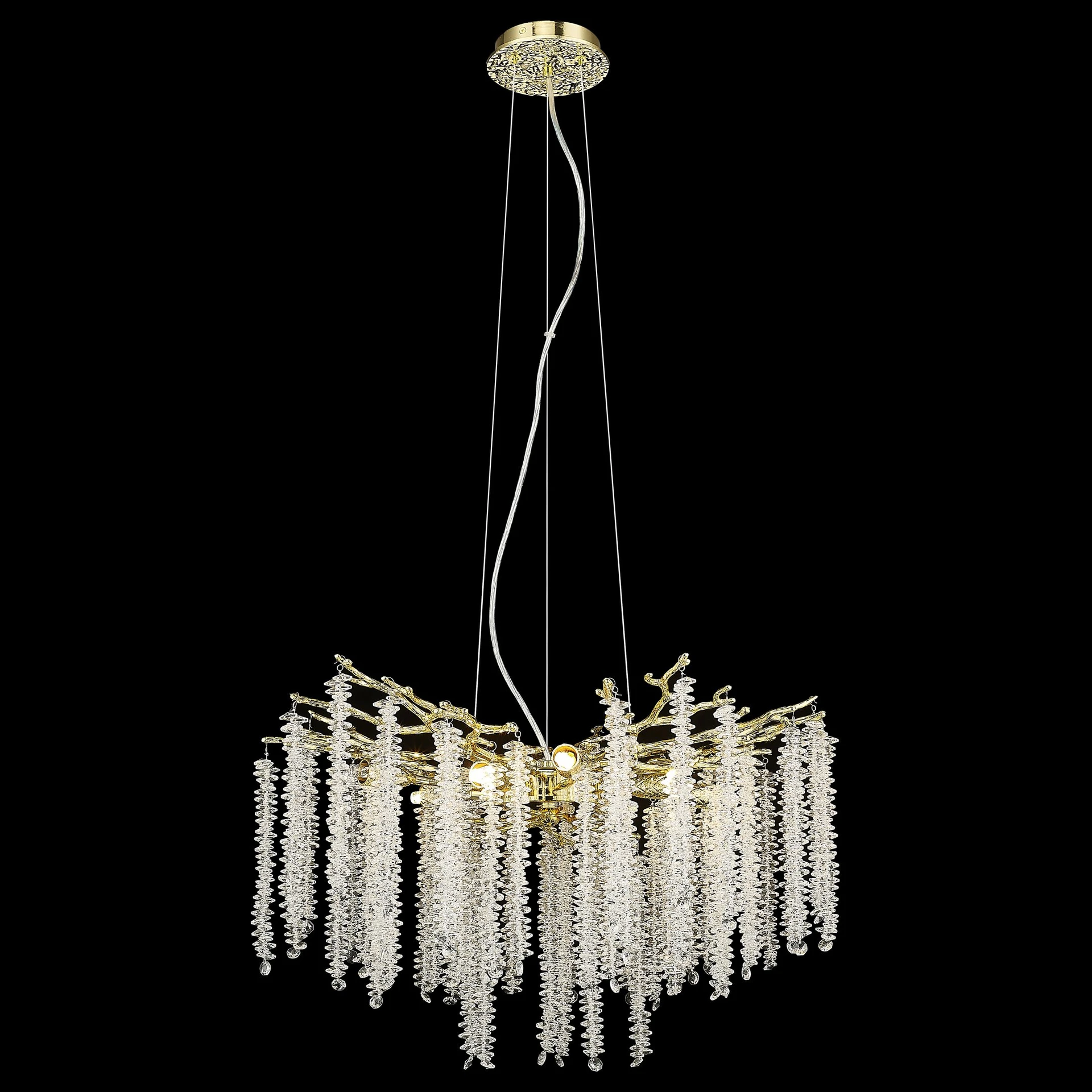 Подвесная люстра Velante 185-303-08 от Velante, подходит для спальни, в стиле современный. Материал — металл, цвет золото, плафон из хрусталь, цвет плафона прозрачный. Модель имеет 8 ламп, цоколь G9, мощность 40 Вт, площадь освещения до 16 кв. м. Крепление — планка. Степень защиты IP20. Габариты: высота 1550 мм, ширина 600 мм, диаметр 600 мм. Декор — хрустальные подвески, коллекция 185.