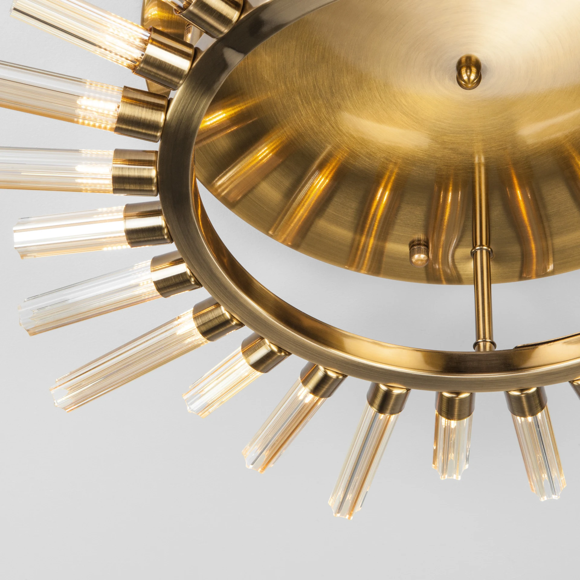 Потолочная люстра Bogates Sole 561 от Bogates, подходит для кухни, для гостиной, для спальни, в стиле современный, арт-деко. Материал — металл, цвет золотая бронза, плафон из стекла, цвет плафона тонированный, форма плафона — ребристый. Модель имеет 27 ламп, цоколь G4, мощность 3 Вт, площадь освещения до 12 кв. м. Направление света — равномерное, крепление — планка. Степень защиты IP20. Габариты: высота 150 мм, ширина 650 мм. Коллекция Sole.
