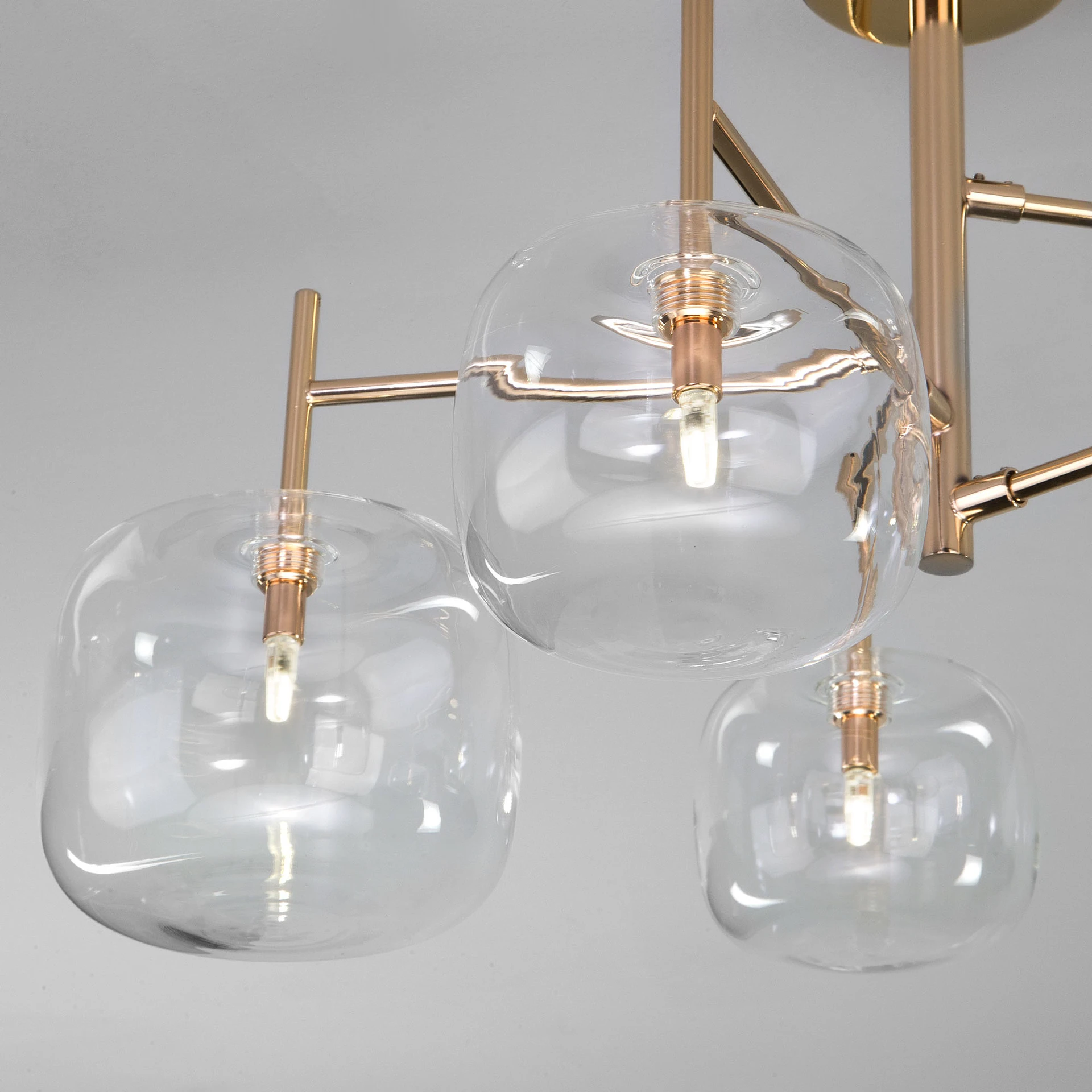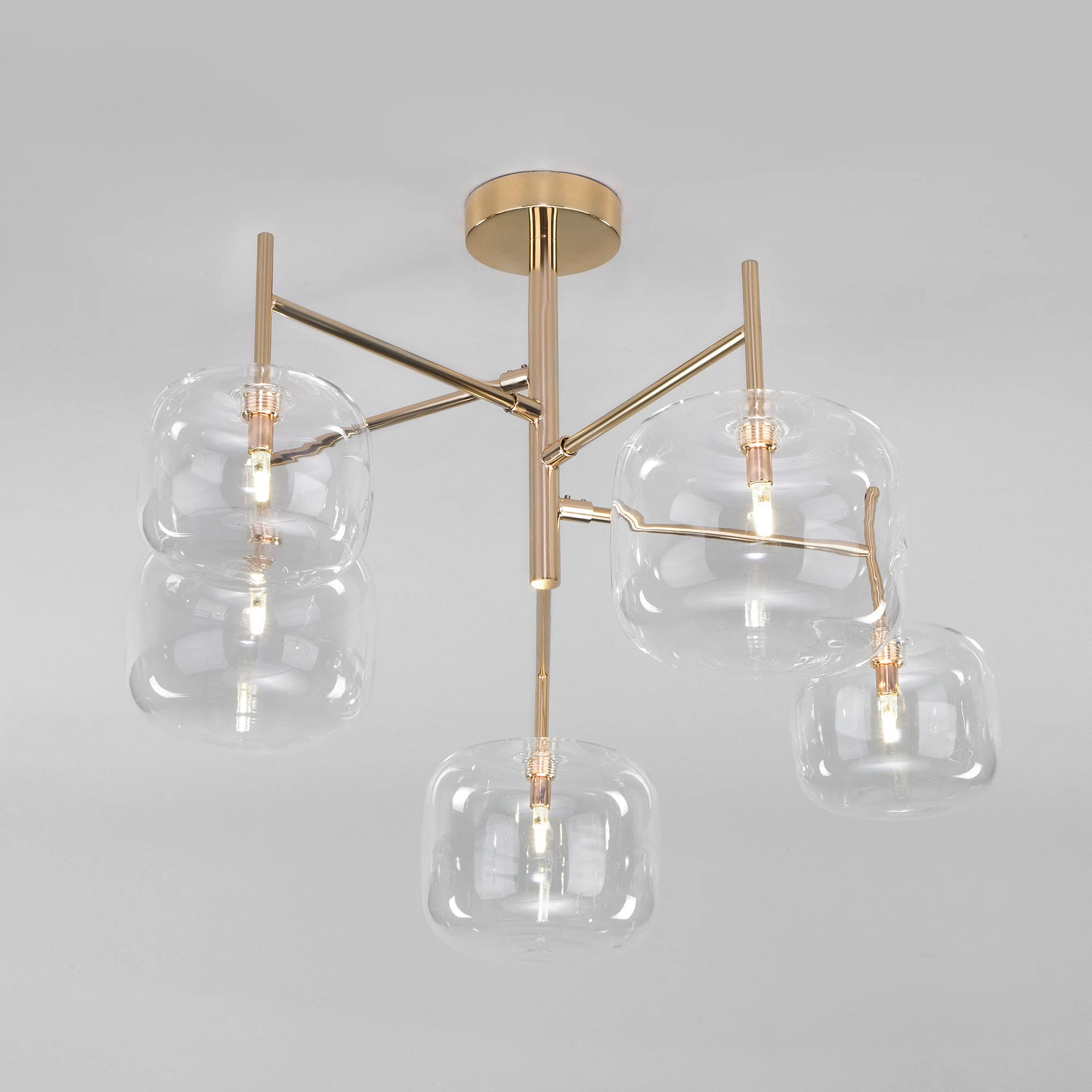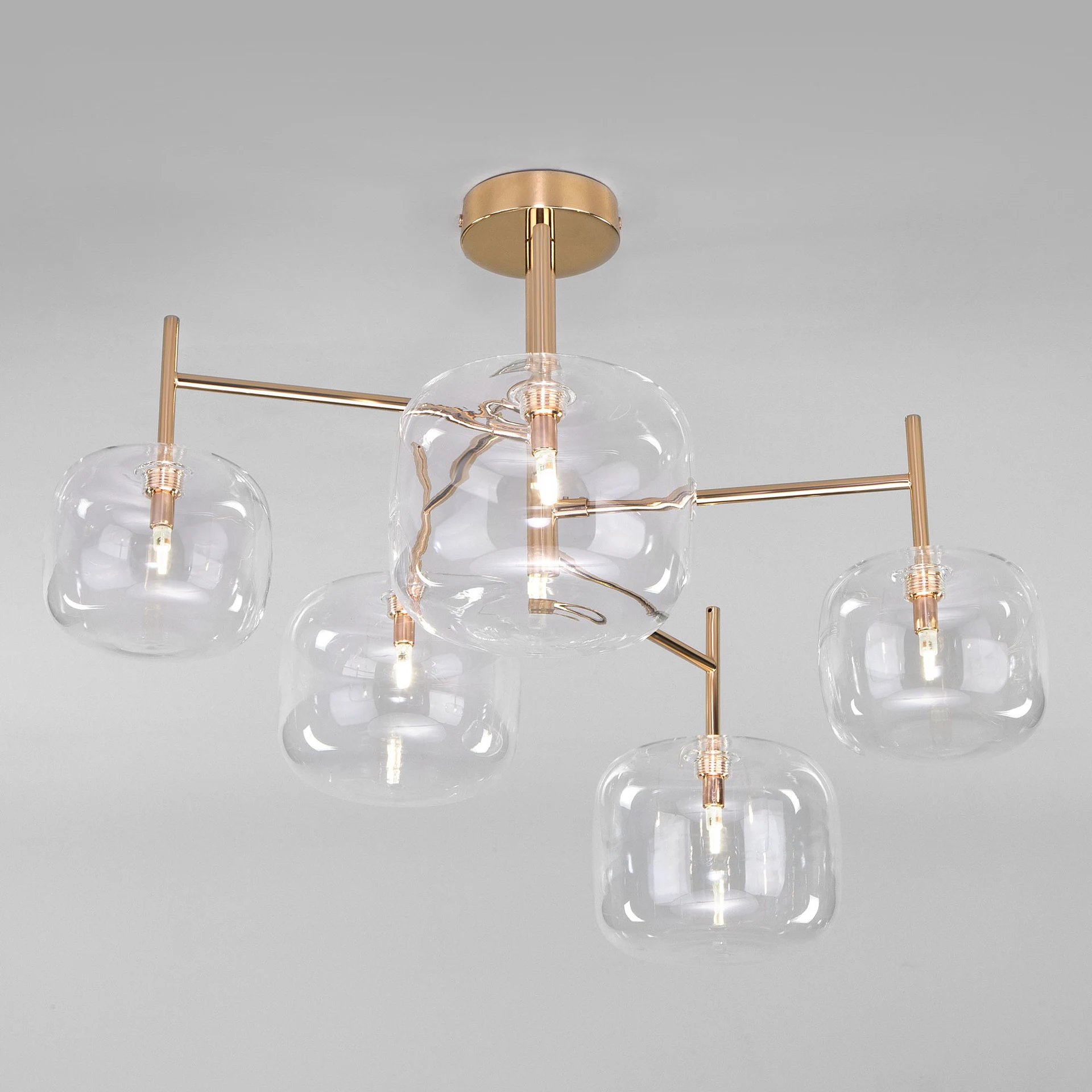 Потолочная люстра Eurosvet Jar 70128/5 золото от Eurosvet, подходит для гостиной, для прихожей, в стиле современный. Материал — металл, цвет золотой, плафон из стекло, цвет плафона прозрачный, форма плафона — шар. Модель имеет 5 ламп, цоколь G4, мощность 3 Вт. Крепление — планка. Степень защиты IP20. Габариты: высота 440 мм, ширина 600 мм. Коллекция Jar, примечание — совместим с умным реле;совместим с умным выключате, класс защиты от поражения электрическим током — I.