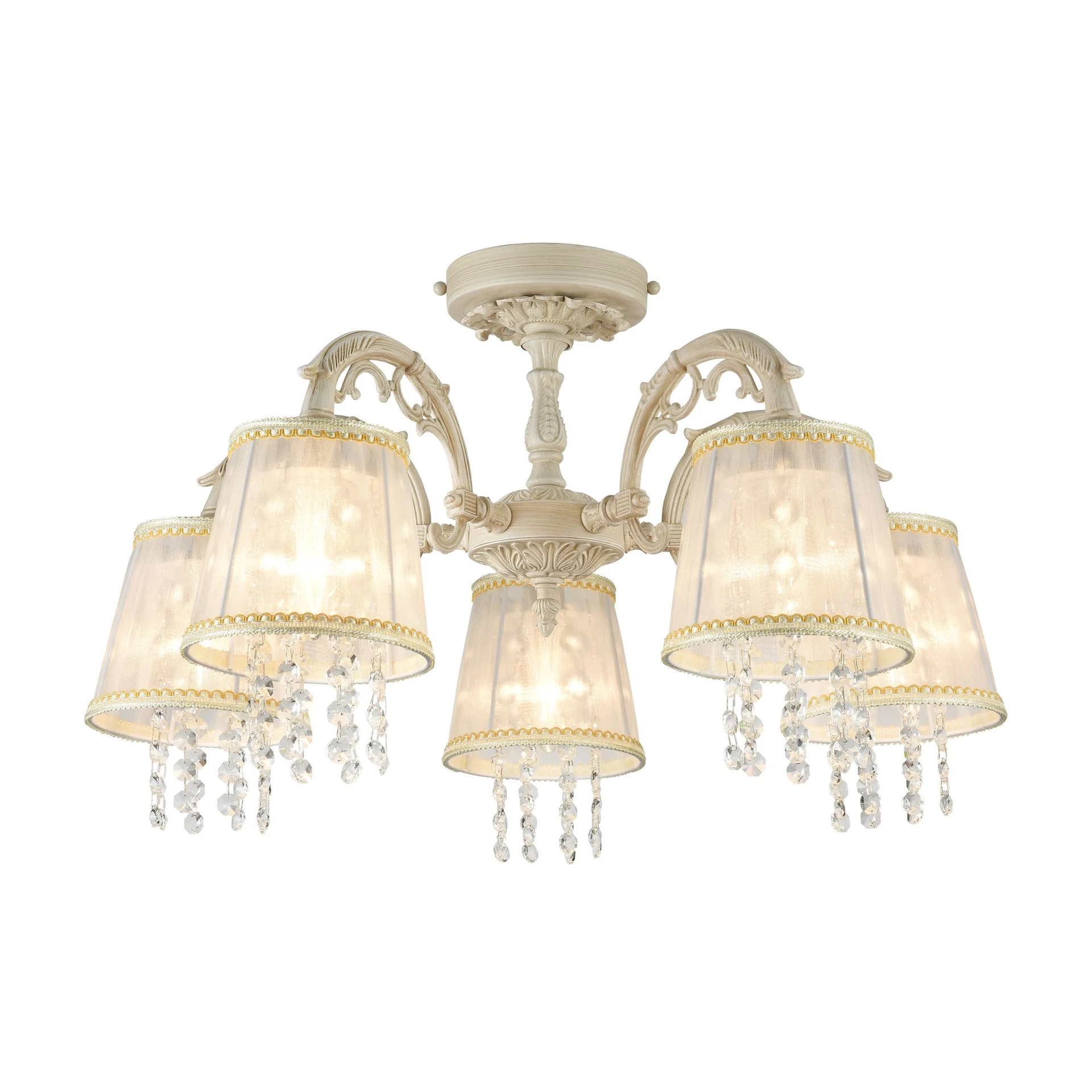 Потолочная люстра Freya Omela FR2220CL-05W от Freya, подходит для спальни, в стиле прованс. Материал — металл, цвет кремовый, форма плафона — круглый абажур. Модель имеет 5 ламп, цоколь E14, мощность 40 Вт. Направление света — вниз. Габариты: высота 360 мм, ширина 620 мм, диаметр 620 мм. Декор — хрустальные подвески, коллекция Omela.