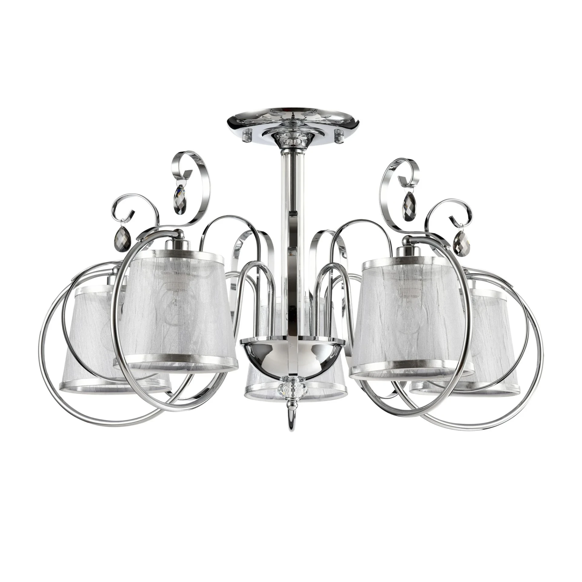 Потолочная люстра Freya Simone FR2020-CL-05-CH от Freya, подходит для гостиной, в стиле классика. Материал — кристалл, цвет хром, плафон из органза, форма плафона — круглый абажур. Модель имеет 5 ламп, цоколь E14, мощность 40 Вт. Крепление — планка. Степень защиты IP20. Габариты: высота 409 мм, ширина 739 мм, диаметр 739 мм. Декор — хрустальные подвески, коллекция Simone.