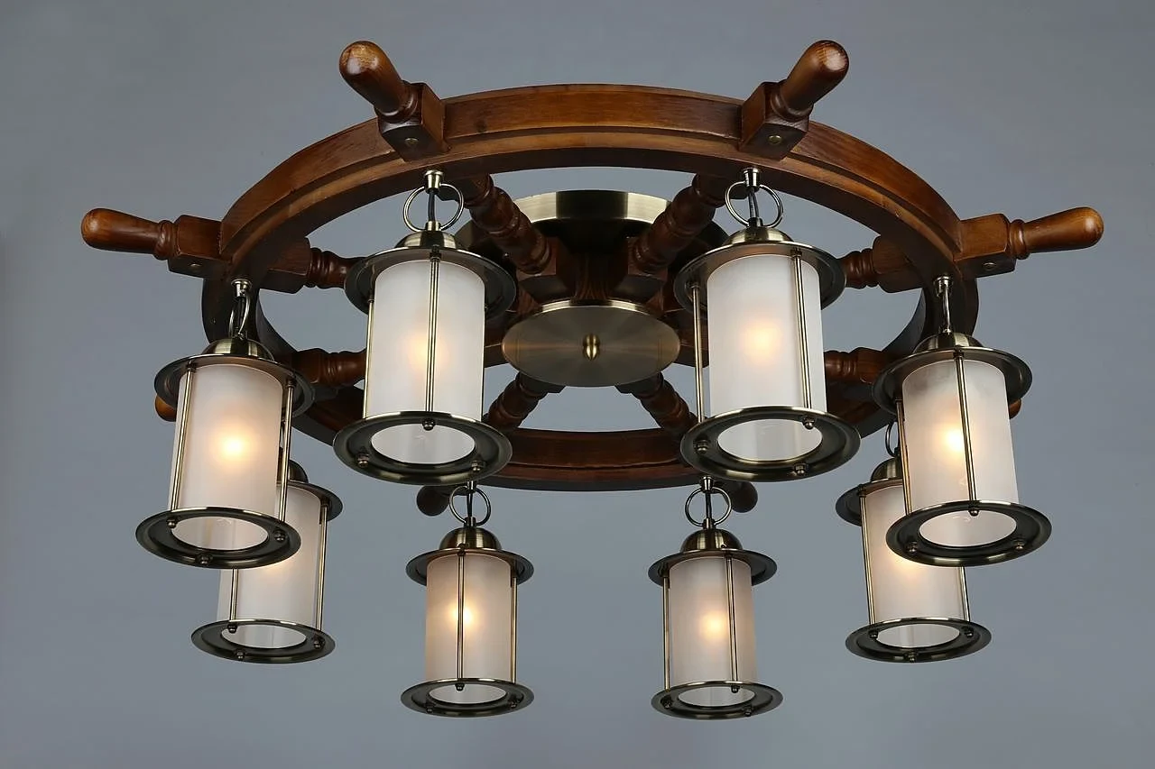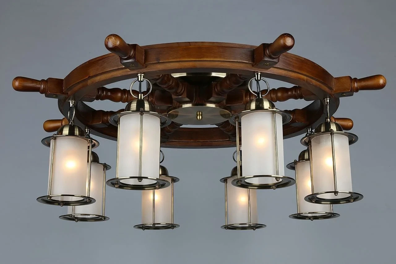 Потолочная люстра Omnilux Ferro OML-50307-08 от Omnilux, подходит для гостиной, для спальни, в стиле морской. Материал — металл, цвет бронза, плафон из стекла, цвет плафона белый, форма плафона — цилиндр. Модель имеет 8 ламп, цоколь E27, мощность 480 Вт. Габариты: высота 300 мм, ширина 850 мм, диаметр 850 мм.